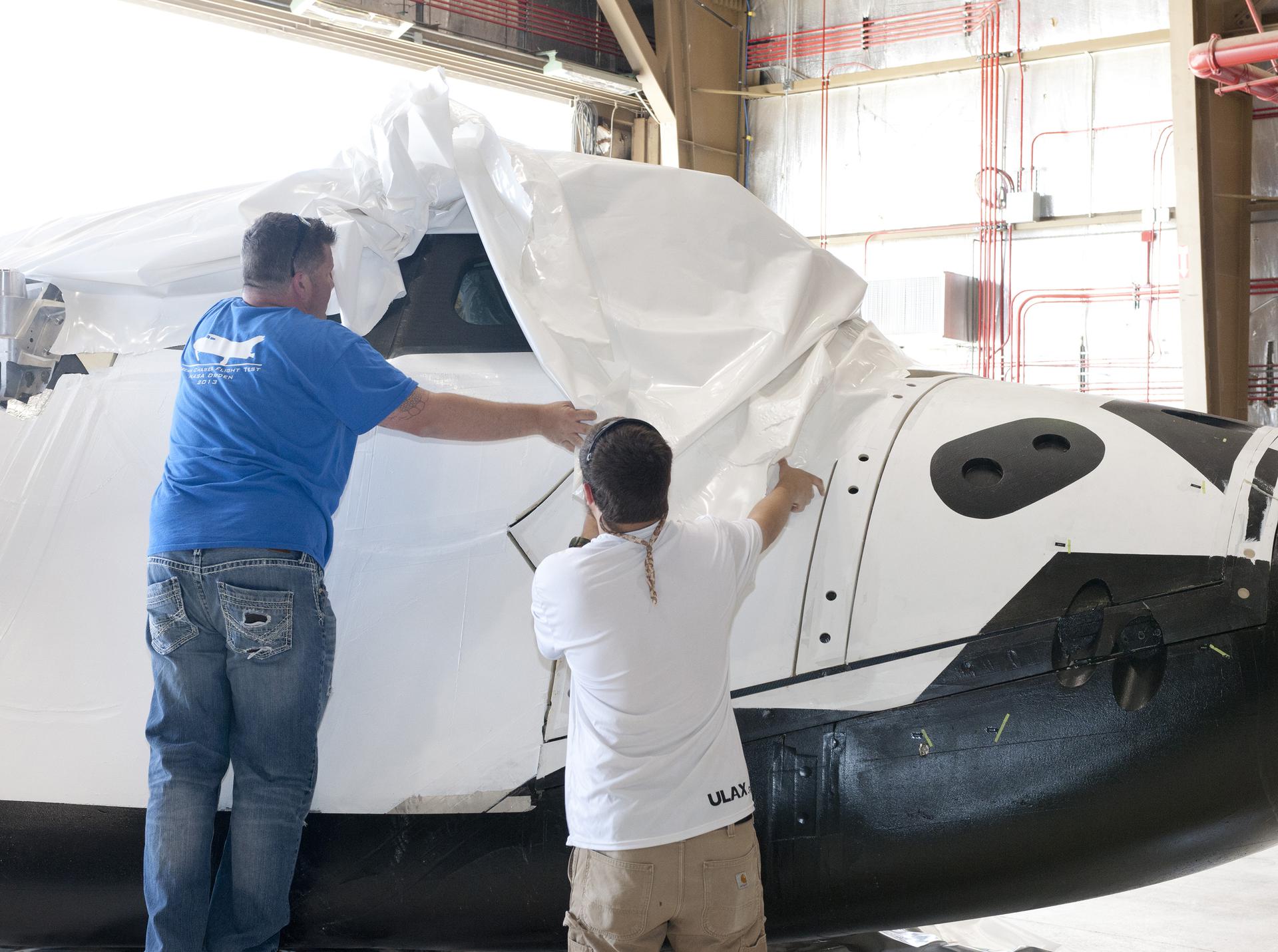 Edwards, Calif. – ED-0144-08 - Plastic wrapping that protected the Sierra Nevada Corporation, or SNC, Dream Chaser flight test vehicle during its transport from Colorado is carefully removed by SNC Dream Chaser crew chief Christian White, left, and SNC employee Will Armijo following the craft's arrival at NASA's Dryden Flight Research Center in southern California. The prototype space access vehicle will undergo ground and approach-and-landing flight tests in the coming months at Dryden as part of NASA's Commercial Crew Program, or CCP, development work. SNC is one of three companies working with CCP during the agency's Commercial Crew Integrated Capability, or CCiCap, initiative, which is intended to lead to the availability of commercial human spaceflight services for government and commercial customers. To learn more about CCP and its industry partners, visit www.nasa.gov_commercialcrew. Image credit: NASA_Tom Tschida