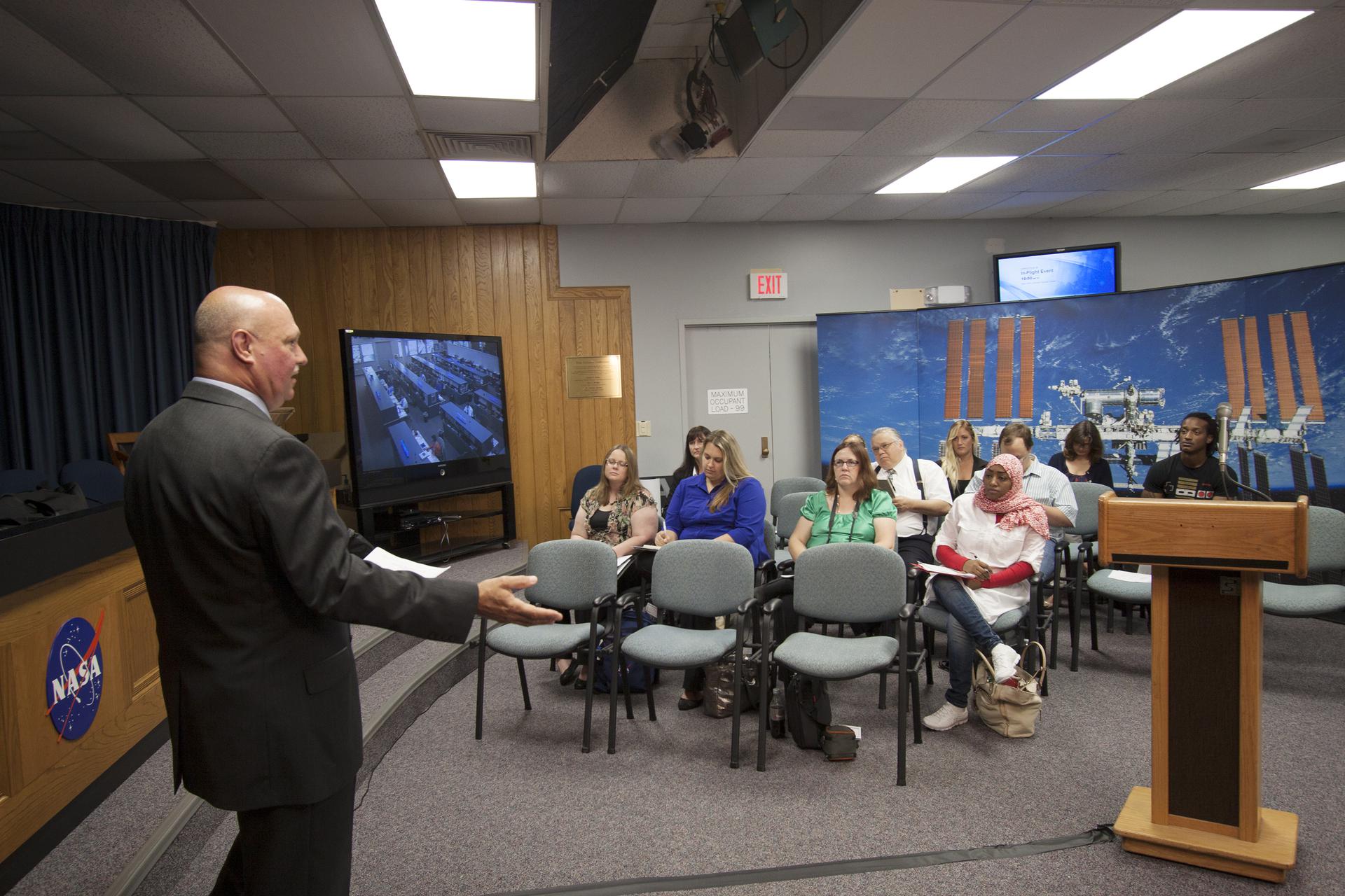 CAPE CANAVERAL, Fla. – Michael Curie, NASA Public Affairs, addresses nine Florida Institute of Technology aspiring journalists in the Press Site auditorium at NASA's Kennedy Space Center in Florida on May 22. The journalists, in collaboration with Florida Today, are working on a multimedia project that examines health in zero gravity and how life in space can help people live better on Earth. These multimedia stories will be published for the print and online versions of Florida Today. During their visit, the journalists interviewed astronaut and Expedition 35 flight engineer Chris Cassidy during an International Space Station downlink, after which they worked on multimedia deadline news assignments at the Press Site. They also met with Kennedy Director Bob Cabana who talked about NASA's goals for the future and his own experience in space, answering questions about health effects of spaceflight. The journalists toured the Vehicle Assembly Building and the Apollo Saturn V Center. Learn about the Florida Institute of Technology journalists' findings on their Facebook page at http:__www.facebook.com_FT3atFIT or Twitter at #SpaceHealth. Photo credit: NASA_Jim Grossmann