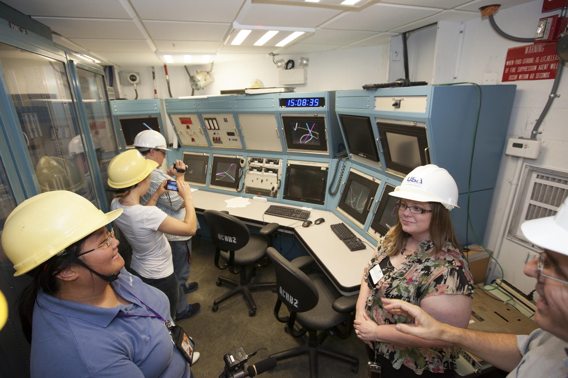 CAPE CANAVERAL, Fla. – A group of nine Florida Institute of Technology aspiring journalists observe the interior of the mobile launcher inside the Vehicle Assembly Building, or VAB, at NASA's Kennedy Space Center in Florida on May 22. The group of students, in collaboration with Florida Today, is working on a multimedia project that examines health in zero gravity and how life in space can help people live better on Earth. These multimedia stories will be published for the print and online versions of Florida Today. At left is Florida Today videographer Caroline Perez. During their visit, the students interviewed astronaut and Expedition 35 flight engineer Chris Cassidy during an International Space Station downlink in the Press Site auditorium. The journalists also met with Kennedy Director Bob Cabana who talked about NASA's goals for the future and his own experience in space, answering questions about health effects of spaceflight. The journalists also toured the Apollo Saturn V Center. Learn about the Florida Institute of Technology journalists' findings on their Facebook page at http:__www.facebook.com_FT3atFIT or Twitter at #SpaceHealth. Photo credit: Photo credit: NASA_Kim Shiflett