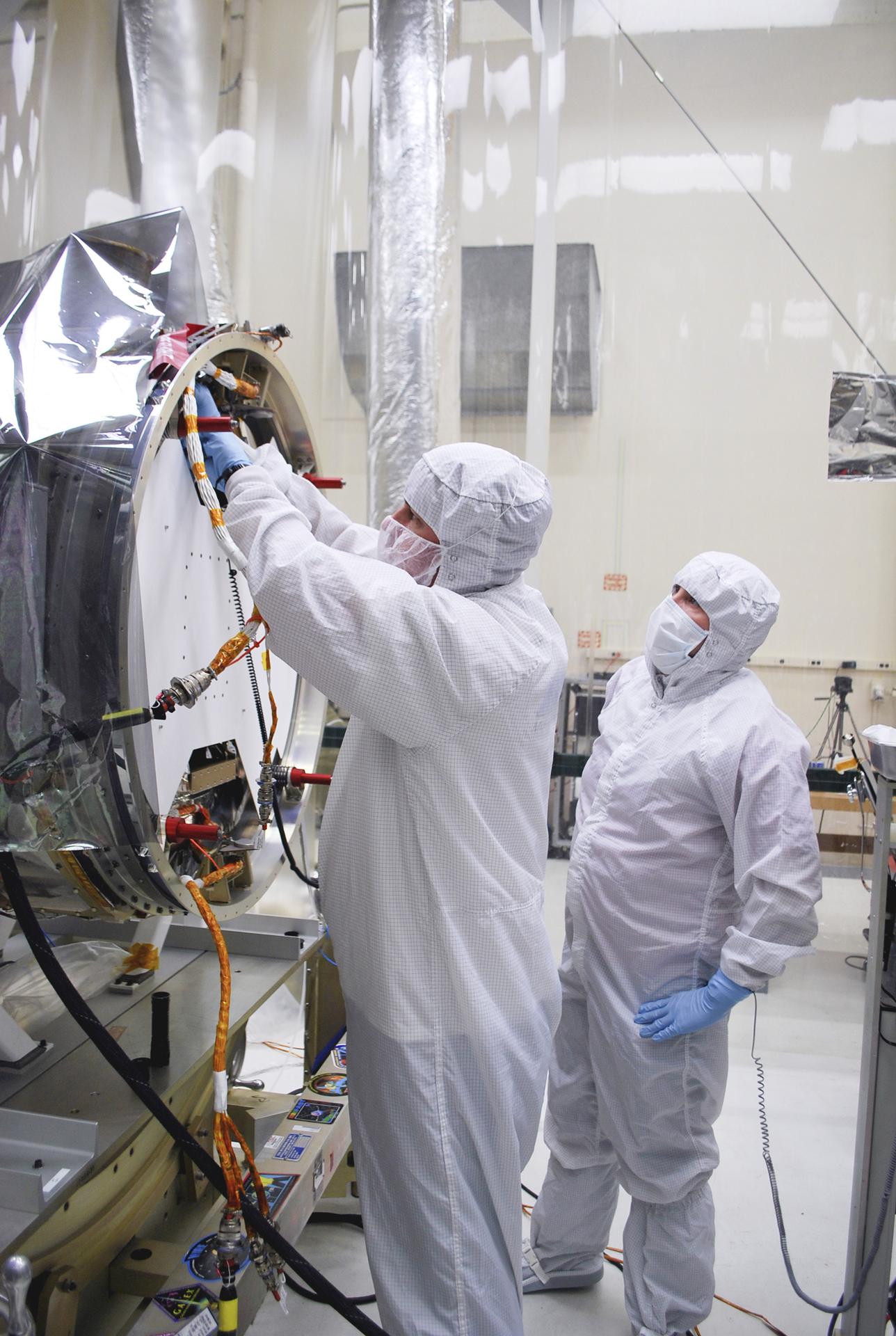 VANDENBERG, AFB - Engineers and members of the IRIS-Pegasus launch team re-verify the spacecraft ahead of the next flight simulation for the mission. The work is taking place in a hangar at Vandenberg where NASA's IRIS spacecraft, short for Interface Region Imaging Spectrograph, is being prepared for launch on a Pegasus XL rocket. Scheduled for launch from Vandenberg Air Force Base no earlier than June 26, 2013, IRIS will open a new window of discovery by tracing the flow of energy and plasma through the chromospheres and transition region into the sun’s corona using spectrometry and imaging. IRIS fills a crucial gap in our ability to advance studies of the sun-to-Earth connection by tracing the flow of energy and plasma through the foundation of the corona and the region around the sun known as the heliosphere. Photo credit: NASA_Randy Beaudoin