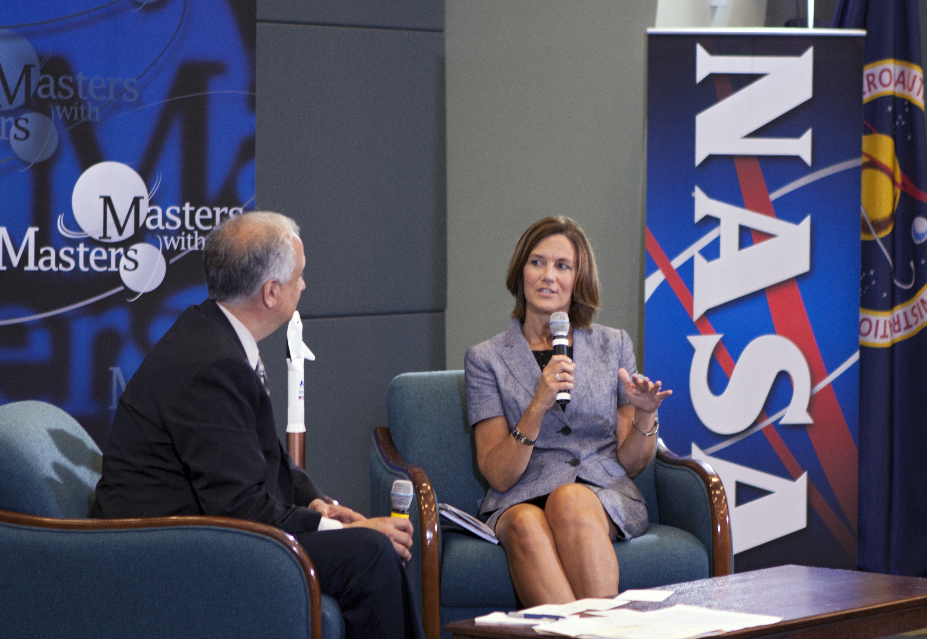 CAPE CANAVERAL, Fla. – Ed Hoffman and Lisa Colloredo discuss NASA's Commercial Crew Program during the first of a weeklong series called 'Masters with Masters' at the agency's Kennedy Space Center in Florida. Hoffman, NASA's chief Knowledge officer, and Colloredo, associate program manager at Kennedy, were joined by phone by Ed Mango, program manager for CCP. Photo credit: NASA_Jim Grossmann