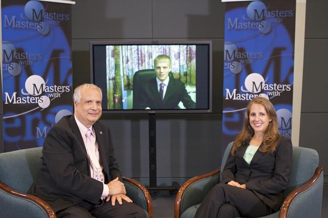 CAPE CANAVERAL, Fla. – At NASA's Kennedy Space Center in Florida, Ed Hoffman and Annie Caraccio discuss the 'Young Professional's Perspective at NASA' during the final day of a weeklong series called 'Masters with Masters.' Hoffman, NASA's chief Knowledge officer, and Caraccio, a chemical engineer in the Engineering and Technology Directorate at Kennedy, were joined by Philip Harris, an International Operations engineer from the Johnson Space Center via a television link with NASA's office in Moscow. Photo credit: NASA_Jim Grossmann
