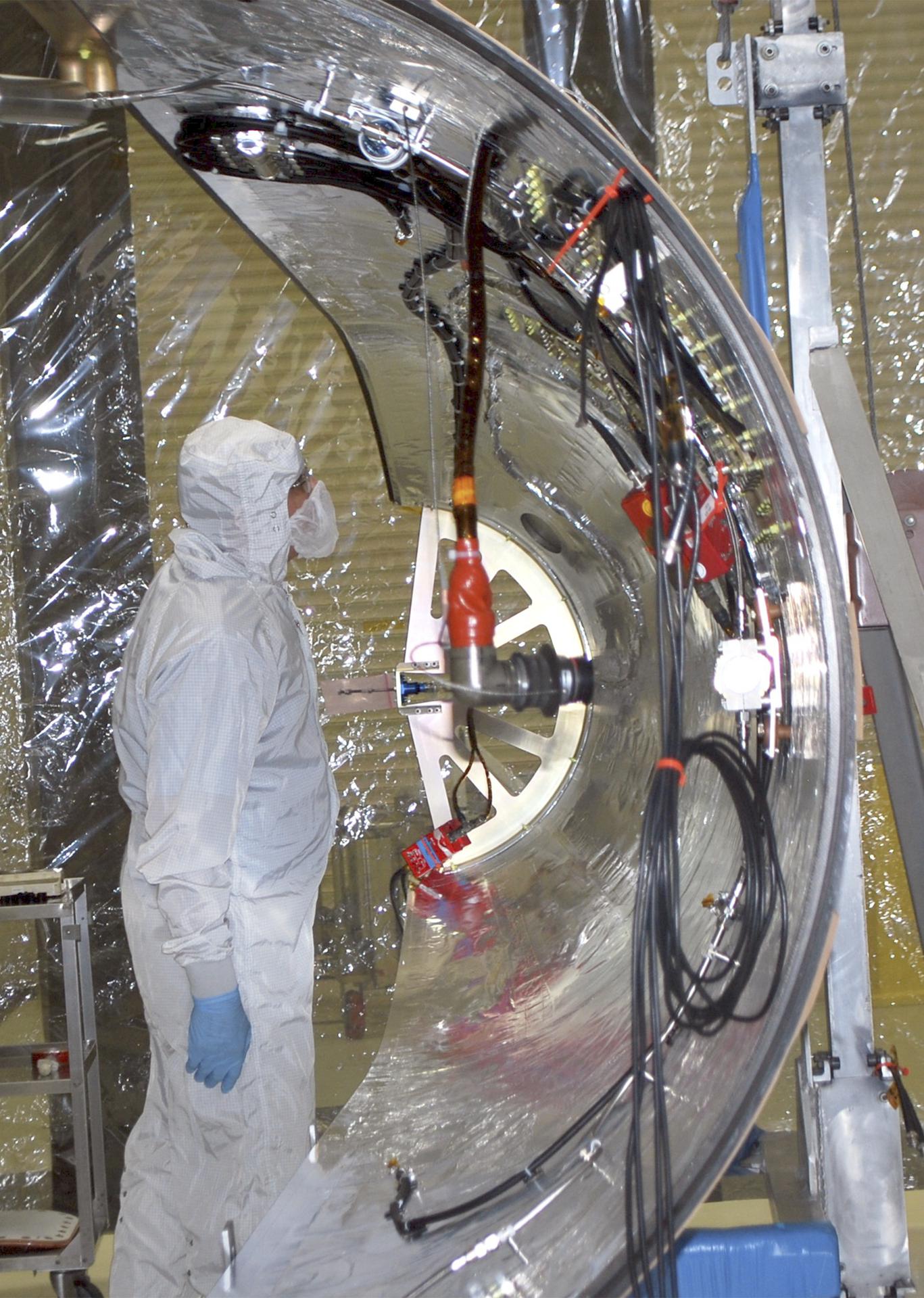 VANDENBERG AFB – An engineer examines the payload fairing into place for NASA's IRIS spacecraft. The fairing connects to the nose of the Orbital Sciences Pegasus XL rocket that will lift the solar observatory into orbit in June. The work is taking place in a hangar at Vandenberg Air Force Base where IRIS, short for Interface Region Imaging Spectrograph, is being prepared for launch on a Pegasus XL rocket. Scheduled for launch from Vandenberg June 26, IRIS will open a new window of discovery by tracing the flow of energy and plasma through the chromospheres and transition region into the sun’s corona using spectrometry and imaging. IRIS fills a crucial gap in our ability to advance studies of the sun-to-Earth connection by tracing the flow of energy and plasma through the foundation of the corona and the region around the sun known as the heliosphere. Photo credit: NASA_Randy Beaudoin