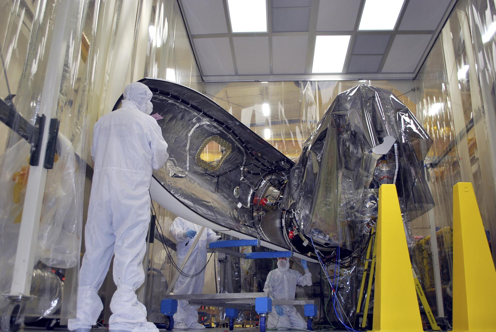 VANDENBERG AFB – Engineers move the payload fairing into place for NASA's IRIS spacecraft. The fairing connects to the nose of the Orbital Sciences Pegasus XL rocket that will lift the solar observatory into orbit in June. The work is taking place in a hangar at Vandenberg Air Force Base where IRIS, short for Interface Region Imaging Spectrograph, is being prepared for launch on a Pegasus XL rocket. Scheduled for launch from Vandenberg June 26, IRIS will open a new window of discovery by tracing the flow of energy and plasma through the chromospheres and transition region into the sun’s corona using spectrometry and imaging. IRIS fills a crucial gap in our ability to advance studies of the sun-to-Earth connection by tracing the flow of energy and plasma through the foundation of the corona and the region around the sun known as the heliosphere. Photo credit: NASA_Randy Beaudoin