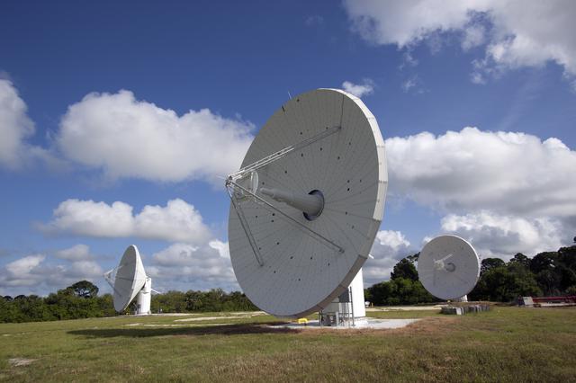 CAPE CANAVERAL, Fla. -- At NASA’s Kennedy Space Center in Florida, one of the three Ka-Band Objects Observation and Monitoring, or Ka-BOOM, testbed antennas is used to track the pattern of the sun during initial testing of the new system. The goal of Ka-BOOM is to prove technologies that will allow future systems to characterize near-Earth objects in terms of size, shape, rotation_tumble rate and to determine the trajectory of those objects. Radar studies can determine the trajectory 100,000 times more precisely than can optical methods. While also capable of space communication and radio science experiments, developing radar applications is the primary focus of the arrays. The 40-foot-diameter dish antenna arrays are at the site of the former Vertical Processing Facility, which has been demolished. Photo credit: NASA_Jim Grossmann