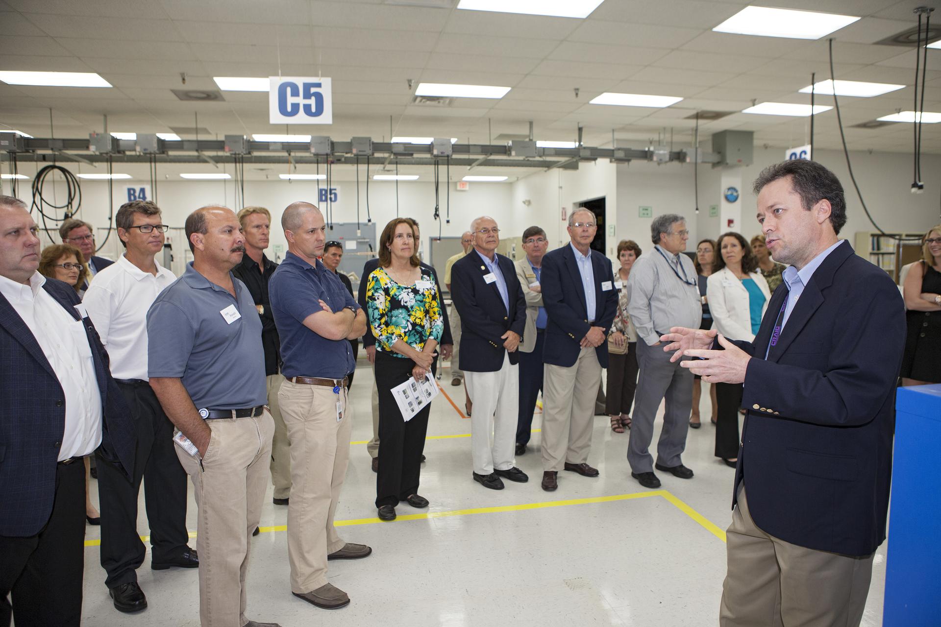 CAPE CANAVERAL, Fla. – At the Aerospace and Defense Manufacturing Center in Cape Canaveral, Fla., Craig Technologies Vice President and Site Director Jim Kell describes operations at the 161,000-square-foot facility during a community open house. In June of last year, NASA signed a partnership agreement with Craig Technologies to maintain an inventory of unique processing and manufacturing equipment for future mission support at the agency's Kennedy Space Center. The Cape Canaveral, Fla., facility, formerly known as the NASA Shuttle Logistics Depot NSLD, is now the Aerospace and Defense Manufacturing Center ADMC. Photo credit: NASA_Kim Shiflett