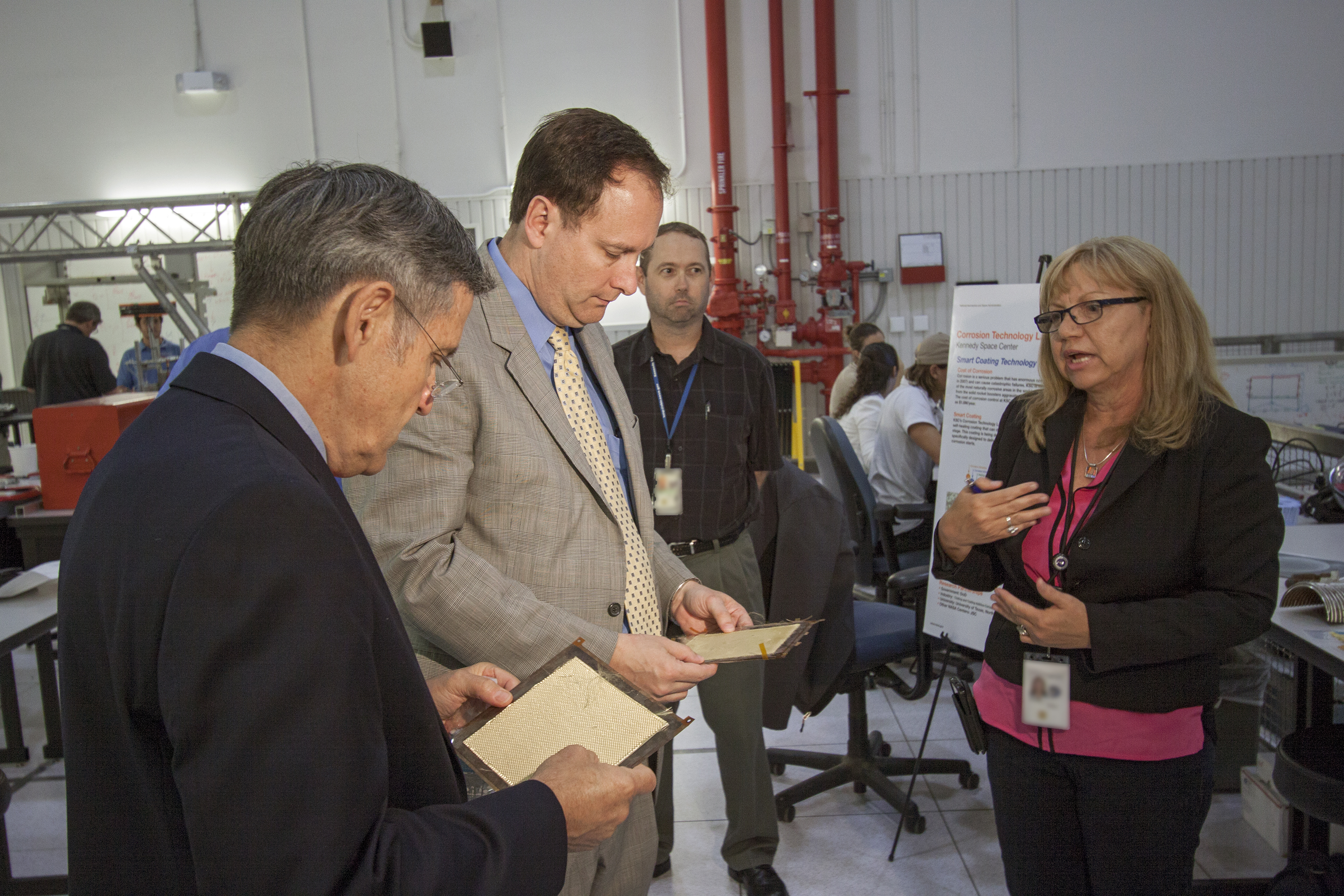 CAPE CANAVERAL, Fla. – At NASA’s Kennedy Space Center in Florida, Robert Lightfoot, NASA associate director, second from left, learns about smart coatings technology in the Corrosion Lab during a tour of the Swamp Works laboratories. Kennedy’s Swamp Works provides rapid, innovative and cost-effective exploration mission solutions, leveraging partnerships across NASA, industry and academia. Kennedy’s research and technology mission is to improve spaceports on Earth, as well as lay the groundwork for establishing spaceports at destinations in space. For more information, visit http:__www.nasa.gov_centers_kennedy_exploration_researchtech_index.html. Photo credit: NASA_Jim Grossmann