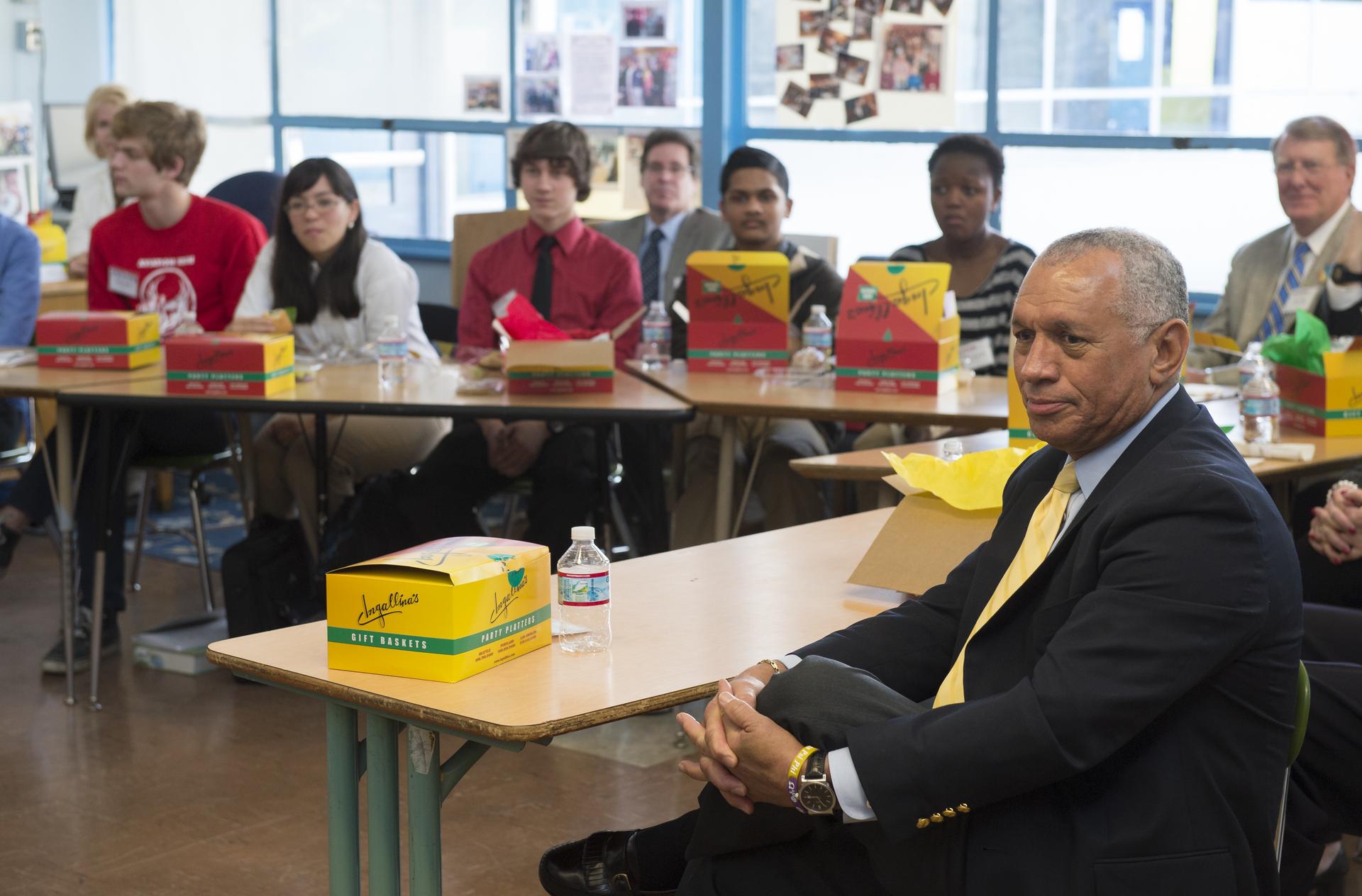 NASA Administrator Charles Bolden listens to students at Aviation High School at a lunch and learn session Tuesday, Jan. 15, 2013 in Des Moines, WA. Aviation High School is a college preparatory aviation- and aerospace-themed school and a premier school of choice for science, technology, engineering and math (STEM) in the Pacific Northwest. Photo Credit: (NASA/Carla Cioffi)