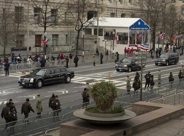 The presidential limousine is seen traveling up Pennsylvania Avenue soon after President Barack Obama departed the White House for Capitol Hill and the swearing-in of Obama as the nation's 44th President, Monday, Jan. 21, 2013, in Washington. Photo Credit: (NASA/Carla Cioffi)