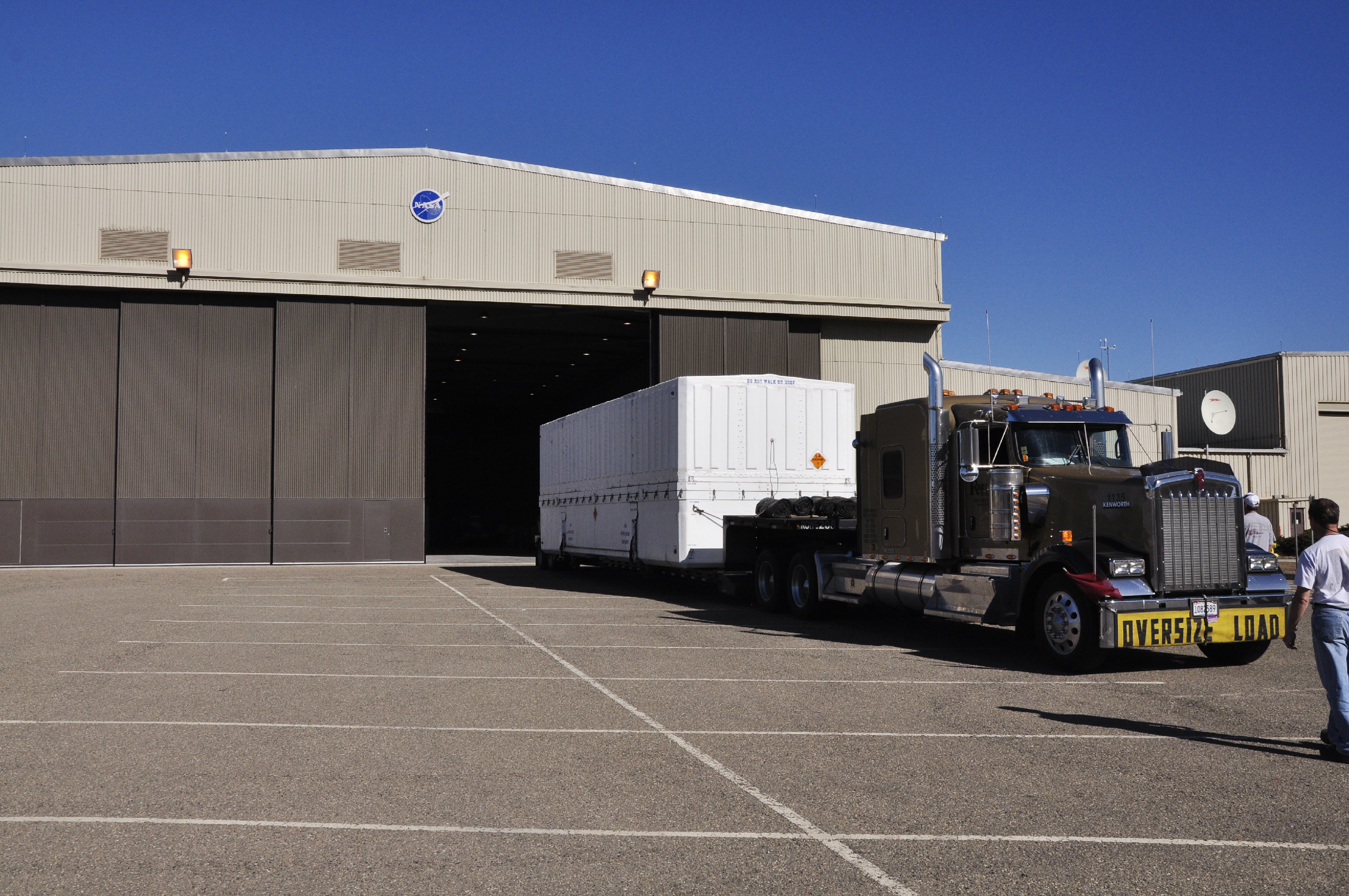 VANDENBERG AIR FORCE BASE, Calif. – The fairing for NASA's Orbiting Carbon Observatory-2, or OCO-2, mission is delivered to the high bay of NASA Building 836 at Vandenberg Air Force Base in California. The fairing will protect OCO-2 during launch aboard a United Launch Alliance Delta II rocket from Space Launch Complex 2 in July. OCO-2 will collect precise global measurements of carbon dioxide in the Earth's atmosphere and provide scientists with a better idea of the chemical compound's impacts on climate change. Scientists will analyze this data to improve our understanding of the natural processes and human activities that regulate the abundance and distribution of this important atmospheric gas. Photo credit: NASA_Randy Beaudoin