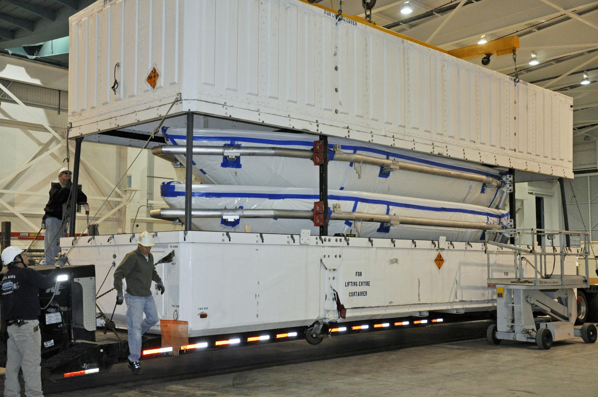 VANDENBERG AIR FORCE BASE, Calif. – The fairing for NASA's Orbiting Carbon Observatory-2 mission, or OCO-2, comes into view as its shipping container is removed in the NASA Building 836 high bay at Vandenberg Air Force Base in California. The fairing will protect OCO-2 during launch aboard a United Launch Alliance Delta II rocket from Space Launch Complex 2 in July. OCO-2 will collect precise global measurements of carbon dioxide in the Earth's atmosphere and provide scientists with a better idea of the chemical compound's impacts on climate change. Scientists will analyze this data to improve our understanding of the natural processes and human activities that regulate the abundance and distribution of this important atmospheric gas. To learn more about OCO-2, visit http:__oco.jpl.nasa.gov. Photo credit: NASA_Randy Beaudoin
