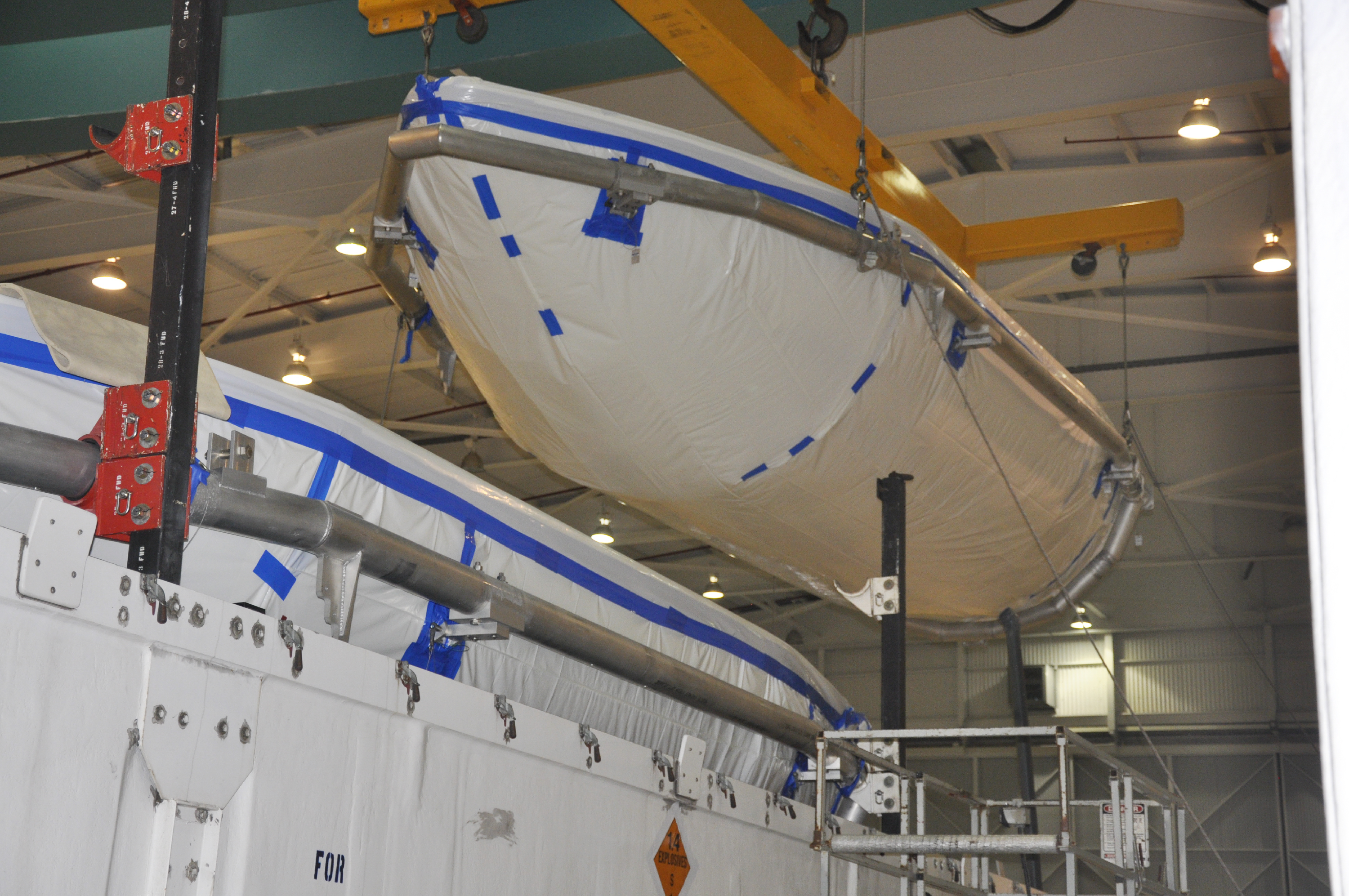 VANDENBERG AIR FORCE BASE, Calif. – In the NASA Building 836 high bay at Vandenberg Air Force Base in California, workers hoist a section of the fairing for NASA's Orbiting Carbon Observatory-2 mission, or OCO-2, from its shipping container. The fairing will protect OCO-2 during launch aboard a United Launch Alliance Delta II rocket from Space Launch Complex 2 in July. OCO-2 will collect precise global measurements of carbon dioxide in the Earth's atmosphere and provide scientists with a better idea of the chemical compound's impacts on climate change. Scientists will analyze this data to improve our understanding of the natural processes and human activities that regulate the abundance and distribution of this important atmospheric gas. To learn more about OCO-2, visit http:__oco.jpl.nasa.gov. Photo credit: NASA_Randy Beaudoin