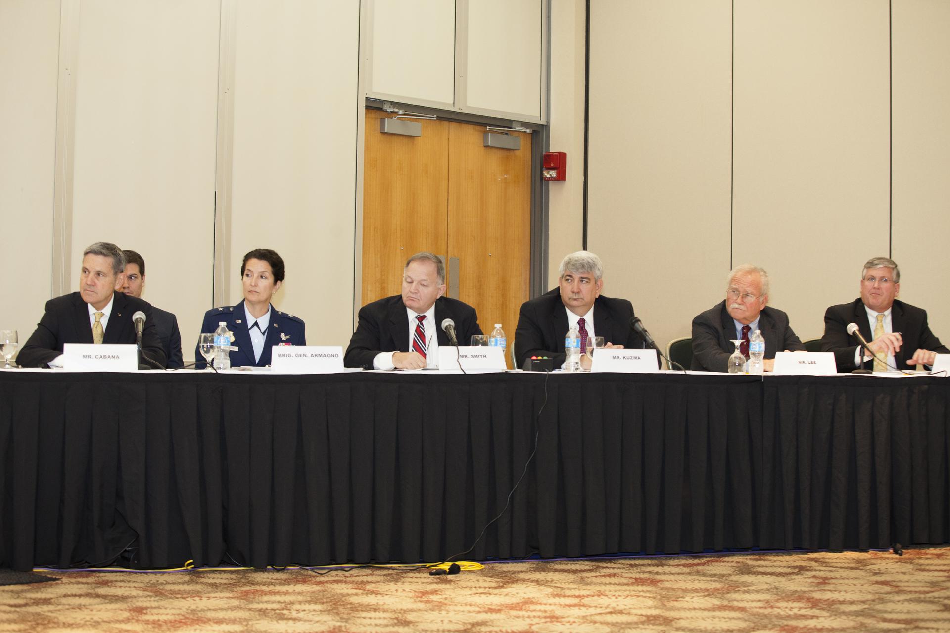 CAPE CANAVERAL, Fla. – At the Kurt H. Debus Conference Facility at the Kennedy Space Center Visitor Complex, witnesses listen during a hearing of the U.S. House of Representatives' Subcommittee on Government Operations. From the left are Bob Cabana, director of the Kennedy Space Center, Brig. Gen. Nina Armagno, commander of the 45th Space Wing and director of the Eastern Range at Patrick Air Force Base, John Smith, regional commissioner of the U.S. General Services Administration, Jim Kuzma, chief operating officer of Space Florida, Charles Lee of the Audubon Society, and John Walsh, chief executive officer of the Canaveral Port Authority. The Congressional hearing took place to review plans for putting vacant buildings and excess property at the Kennedy Space Center to their best and most productive use. Photo credit: NASA_Daniel Casper
