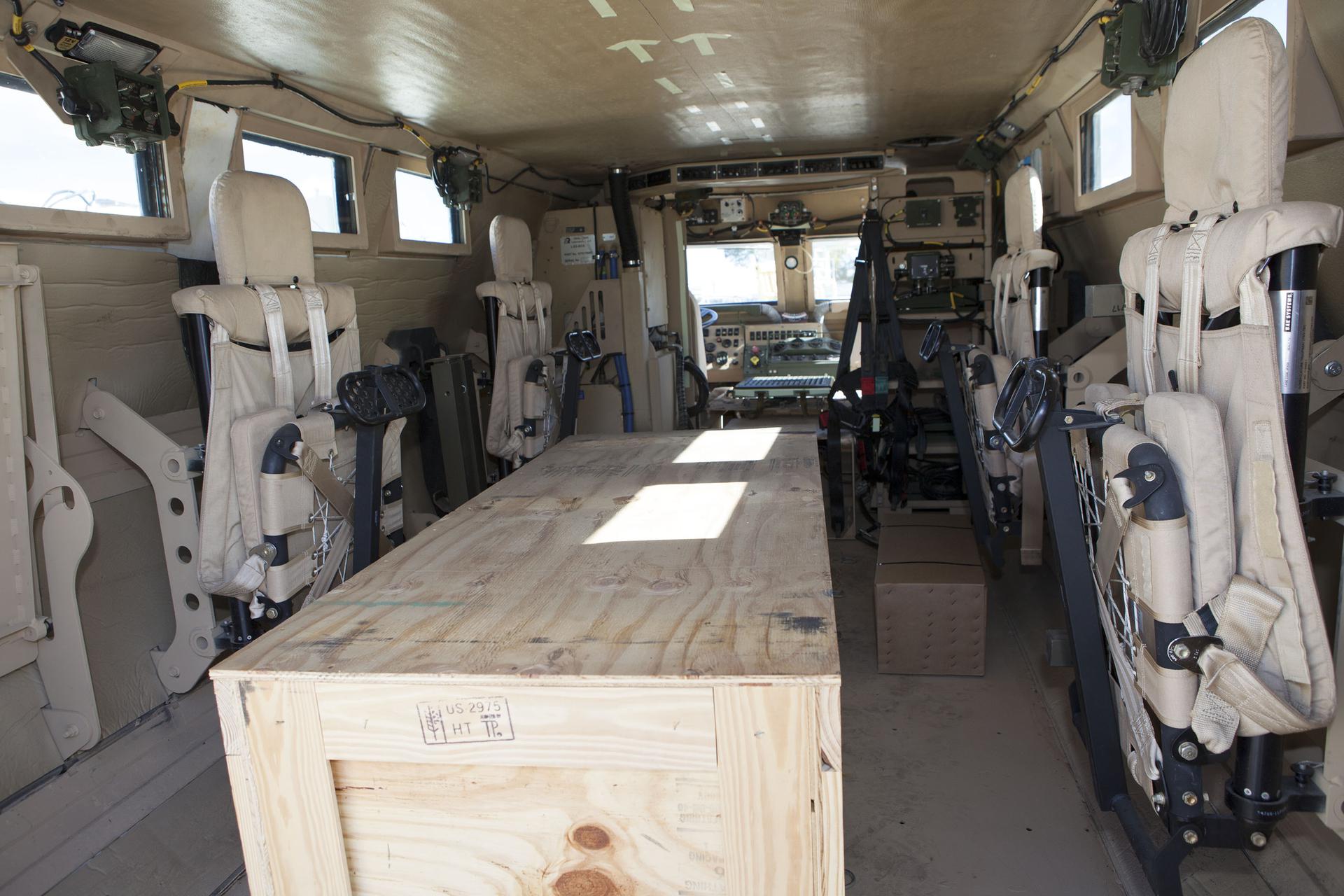 CAPE CANAVERAL, Fla. – A view of the interior of one of four new emergency egress vehicles, called Mine-Resistant Ambush-Protected, or MRAP, vehicles is shown. The MRAPs are at the Maintenance and Operations Facility at NASA’s Kennedy Space Center in Florida. The MRAPs arrived from the U.S. Army Red River Depot in Texarkana, Texas in December 2013. The vehicles were processed in and then transported to the Rotation, Processing and Surge Facility near the Vehicle Assembly Building for temporary storage. The Ground Systems Development and Operations Program at Kennedy led the efforts to an emergency egress vehicle that future astronauts could quickly use to leave the Launch Complex 39 area in case of an emergency. During crewed launches of NASA’s Space Launch System and Orion spacecraft, the MRAP will be stationed by the slidewire termination area at the pad. In case of an emergency, the crew will ride a slidewire to the ground and immediately board the MRAP for safe egress from the pad. The new vehicles replace the M-113 vehicles that were used during the Space Shuttle Program. Photo credit: NASA_Kim Shiflett