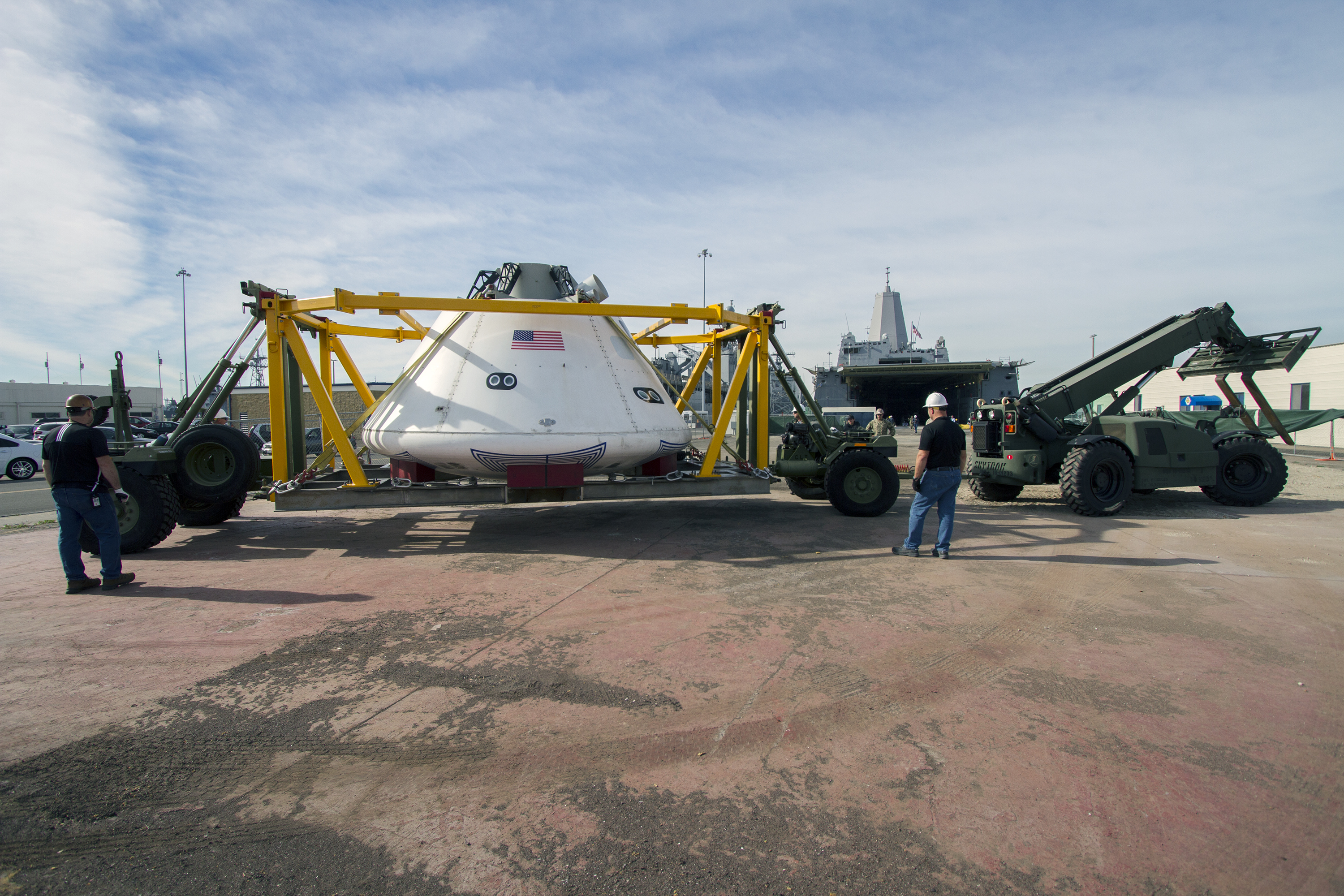 SAN DIEGO, Calif. – The Orion boilerplate test vehicle arrived at the U.S. Naval Base San Diego in California, and was prepared for loading aboard the USS San Diego. Orion was transported in the ship’s well deck about 100 miles offshore for an underway recovery test. NASA and the U.S. Navy are conducting tests to prepare for recovery of the Orion crew module, forward bay cover and parachutes on its return from a deep space mission. The underway recovery test will allow the teams to demonstrate and evaluate the recovery processes, procedures, hardware and personnel in open waters. The Ground Systems Development and Operations Program Orion is the exploration spacecraft designed to carry astronauts to destinations not yet explored by humans, including an asteroid and Mars. It will have emergency abort capability, sustain the crew during space travel and provide safe re-entry from deep space return velocities. The first unpiloted test flight of the Orion is scheduled to launch in 2014 atop a Delta IV rocket and in 2017 on NASA’s Space Launch System rocket. For more information, visit http:__www.nasa.gov_orion. Photo credit: NASA_Cory Huston