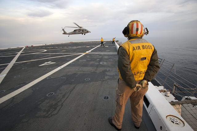 SAN DIEGO, Calif. – On the top deck of the USS San Diego, a helicopter flies overhead to monitor conditions as the Orion underway recovery test begins in the Pacific Ocean, about 100 miles off the coast of San Diego, California. The Orion boilerplate test vehicle and other hardware are secured in the well deck of the ship in preparation for the test. NASA and the U.S. Navy conducted tests to prepare for the recovery of the Orion crew module, forward bay cover and parachutes on its return from a deep space mission. The underway recovery test will allow the teams to demonstrate and evaluate the recovery processes, procedures, hardware and personnel in open waters. During the testing, the tether lines were unable to support the tension caused by crew module motion that was driven by wave turbulence in the well deck of the ship. NASA and the U.S. Navy are reviewing the testing data collected to evaluate the next steps. The Ground Systems Development and Operations Program conducted the underway recovery tests. Orion is the exploration spacecraft designed to carry astronauts to destinations not yet explored by humans, including an asteroid and Mars. It will have emergency abort capability, sustain the crew during space travel and provide safe re-entry from deep space return velocities. The first unpiloted test flight of the Orion is scheduled to launch in 2014 atop a Delta IV rocket and in 2017 on NASA’s Space Launch System rocket. For more information, visit http:__www.nasa.gov_orion. Photo credit: NASA_Cory Huston