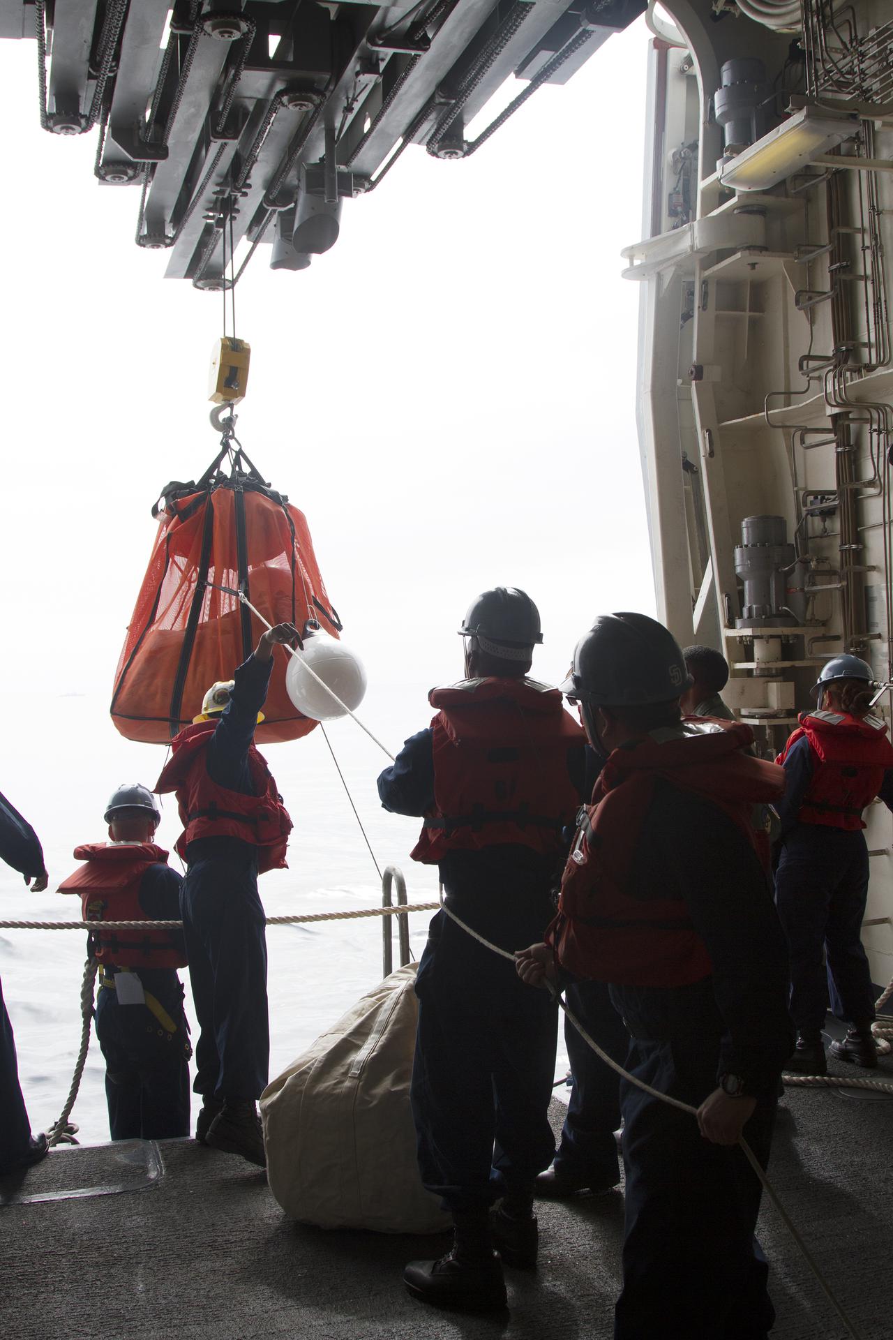 SAN DIEGO, Calif. – On the USS San Diego, NASA and U.S. Navy personnel use a crane to lower a parachute into a rigid hull inflatable boat as part of the Orion underway recovery test. The Orion boilerplate test vehicle and other hardware are secured in the well deck of the ship in preparation for the test about 100 miles off the coast of San Diego, California. NASA and the U.S. Navy conducted tests to prepare for the recovery of the Orion crew module, forward bay cover and parachutes on its return from a deep space mission. The underway recovery test will allow the teams to demonstrate and evaluate the recovery processes, procedures, hardware and personnel in open waters. During the testing, the tether lines were unable to support the tension caused by crew module motion that was driven by wave turbulence in the well deck of the ship. NASA and the U.S. Navy are reviewing the testing data collected to evaluate the next steps. The Ground Systems Development and Operations Program conducted the underway recovery tests. Orion is the exploration spacecraft designed to carry astronauts to destinations not yet explored by humans, including an asteroid and Mars. It will have emergency abort capability, sustain the crew during space travel and provide safe re-entry from deep space return velocities. The first unpiloted test flight of the Orion is scheduled to launch in 2014 atop a Delta IV rocket and in 2017 on NASA’s Space Launch System rocket. For more information, visit http:__www.nasa.gov_orion. Photo credit: NASA_Cory Huston