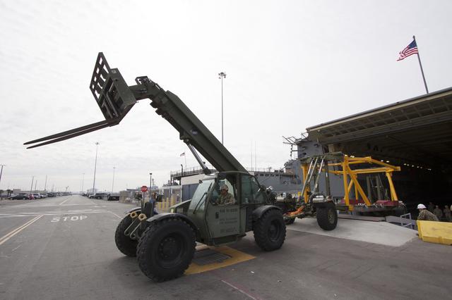 SAN DIEGO, Calif. – Preparations are underway to offload the Orion boilerplate test vehicle from the USS San Diego at the U.S. Naval Base San Diego in California. Orion was transported in the ship’s well deck about 100 miles offshore for an underway recovery test. NASA and the U.S. Navy conducted tests to prepare for recovery of the Orion crew module, forward bay cover and parachutes on its return from a deep space mission. The underway recovery test allowed the teams to demonstrate and evaluate the recovery processes, procedures, hardware and personnel in open waters. During the testing, the tether lines were unable to support the tension caused by crew module motion that was driven by wave turbulence in the well deck of the ship. NASA and the U.S. Navy are reviewing the testing data collected to evaluate the next steps. The Ground Systems Development and Operations Program was conducting the recovery tests. Orion is the exploration spacecraft designed to carry astronauts to destinations not yet explored by humans, including an asteroid and Mars. It will have emergency abort capability, sustain the crew during space travel and provide safe re-entry from deep space return velocities. The first unpiloted test flight of the Orion is scheduled to launch in 2014 atop a Delta IV rocket and in 2017 on NASA’s Space Launch System rocket. For more information, visit http:__www.nasa.gov_orion. Photo credit: NASA_Cory Huston