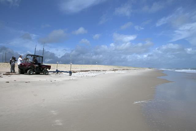 CAPE CANAVERAL, Fla. -- At the Kennedy Space Center in Florida, University of Florida geologists and NASA biologists use an all-terrain vehicle to survey sand dunes that have been restored along a 1.2 mile stretch of shoreline near Launch Pads 39A and B. As part of a six-month effort to help prevent further erosion, 180,000 shrubs, including grasses, sunflowers, vines, sea grapes and palmettos were planted. Constant pounding from tropical storms, such as Hurricane Sandy in October of 2012, other weather systems and higher than usual tides, destroyed sand dunes protecting infrastructure at the spaceport. Photo credit: NASA/Dan Casper