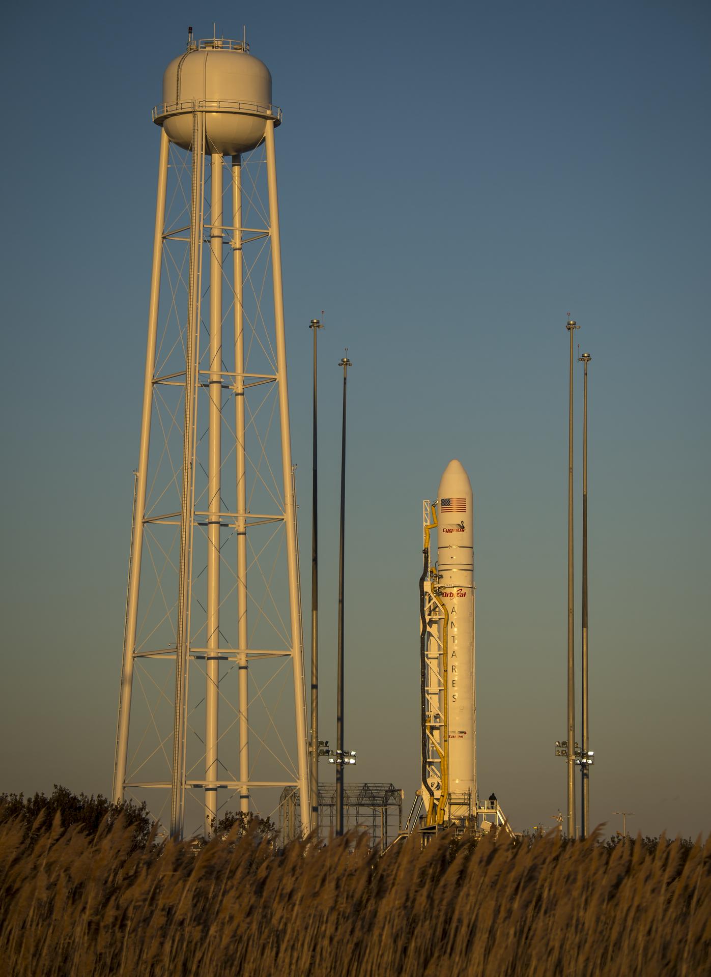 An Orbital Sciences Corporation Antares rocket is seen on launch Pad-0A at NASA's Wallops Flight Facility, Tuesday, January 7, 2014 in advance of a planned Wednesday, Jan. 8th, 1:32 p.m. EST launch, Wallops Island, VA. The Antares will launch a Cygnus spacecraft on a cargo resupply mission to the International Space Station. The Orbital-1 mission is Orbital Sciences' first contracted cargo delivery flight to the space station for NASA. Among the cargo aboard Cygnus set to launch to the space station are science experiments, crew provisions, spare parts and other hardware. Photo Credit: (NASA/Bill Ingalls)