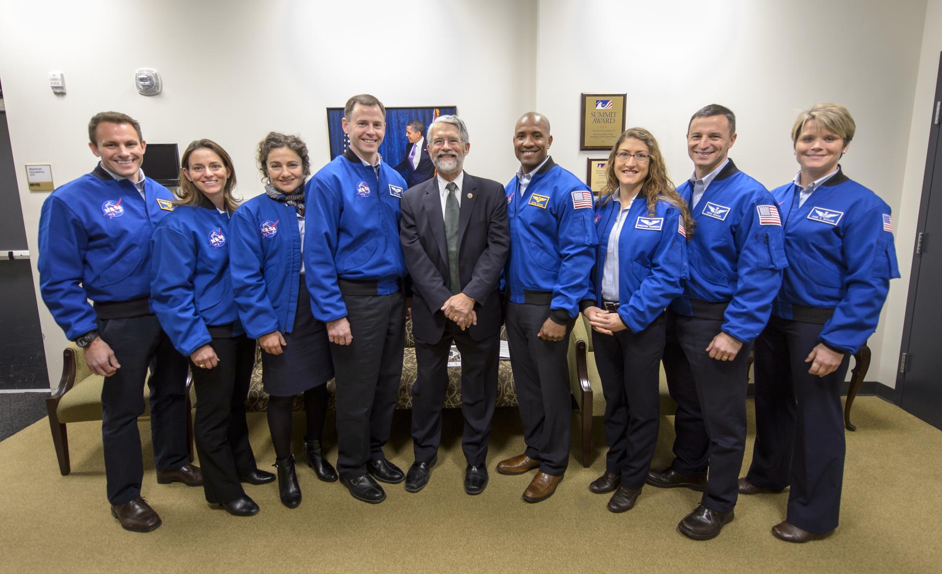 Dr. John P. Holdren, Assistant to the President for Science and Technology and Director of the White House Office of Science & Technology Policy, center, poses for a group photograph with NASA's 2013 astronaut candidates, from left, Josh A. Cassada, Nicole Aunapu Mann, Jessica U. Meir, Tyler N. "Nick" Hague, Holdren, Victor J. Glover, Christina M. Hammock, Andrew R. Morgan, and, Anne C. McClain at the annual White House State of Science, Technology, Engineering, and Math (SoSTEM) address, Wednesday, Jan. 29, 2014, in the South Court Auditorium in the Eisenhower Executive Office Building on the White House complex in Washington. Photo Credit: (NASA/Bill Ingalls)