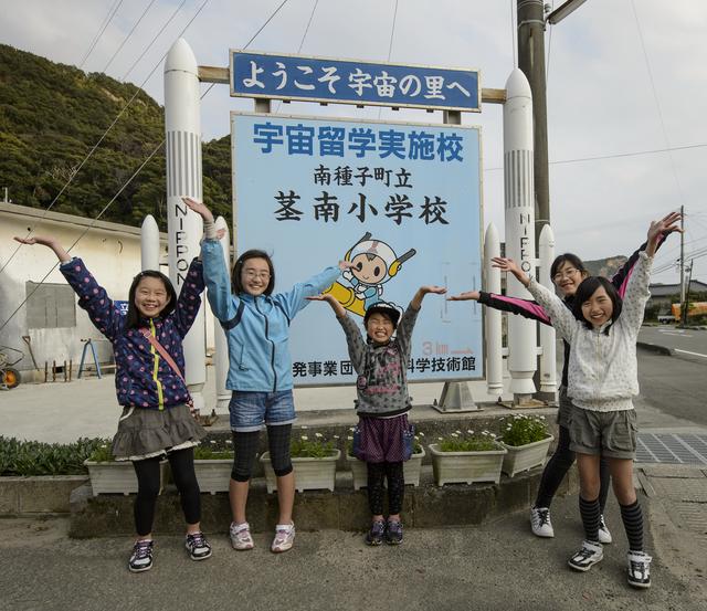 Minamitane elementary school girls pose for a photo in front of a sign featuring the town's mascot "Chuta-kun", Sunday, Feb. 23, 2014, Tanegashima Island, Japan. The Chuta-kun mascot rides a rocket and has guns on the side of his helmet to show the areas history as the site of the first known contact of Europe and the Japanese, in 1543 and the introduction of the gun. A Japanese H-IIA rocket carrying the NASA-Japan Aerospace Exploration Agency (JAXA), Global Precipitation Measurement (GPM) Core Observatory is planned for launch from the space center on Feb. 28, 2014. Once launched, the GPM spacecraft will collect information that unifies data from an international network of existing and future satellites to map global rainfall and snowfall every three hours. Photo Credit: (NASA/Bill Ingalls)