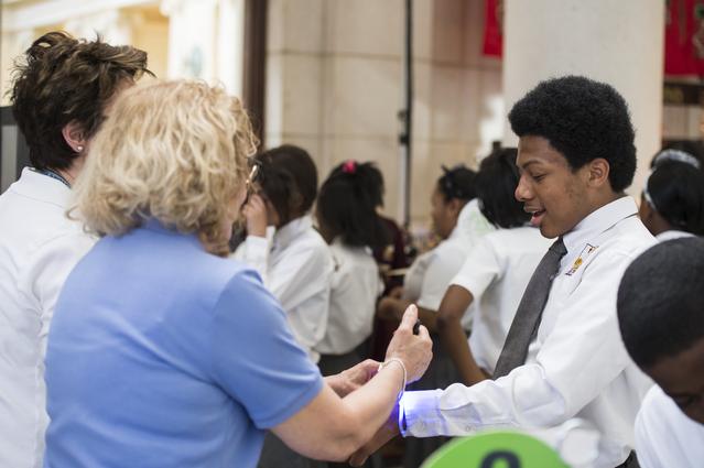 An attendee of NASA's Earth Day event observes the glow from a bracelet that is part of an exhibit at the event. The Earth Day event took place at Union Station in Washington, DC on April 22, 2014. Photo Credit: (NASA/Aubrey Gemignani)