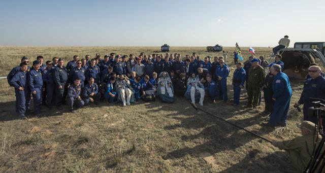 Expedition 39 Commander Koichi Wakata of the Japan Aerospace Exploration Agency (JAXA), left, Soyuz Commander Mikhail Tyurin of Roscosmos, center, and Flight Engineer Rick Mastracchio of NASA, sit in chairs outside the Soyuz TMA-11M capsule and pose for a group photo with the landing team after they landed in a remote area near the town of Zhezkazgan, Kazakhstan on Wednesday, May 14, 2014. Wakata, Tyurin and Mastracchio returned to Earth after more than six months onboard the International Space Station where they served as members of the Expedition 38 and 39 crews. Photo Credit: (NASA/Bill Ingalls)