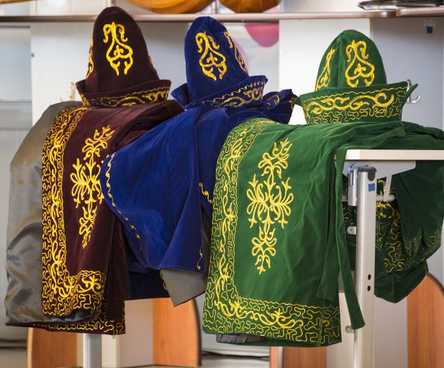 Ceremonial Kazakh hats and robes are laid out to be presented to Expedition 39 Commander Koichi Wakata of the Japan Aerospace Exploration Agency (JAXA), Soyuz Commander Mikhail Tyurin of Roscosmos, and Flight Engineer Rick Mastracchio of NASA at a welcome ceremony, Wednesday, May 14, 2014 at the Karaganda Airport in Kazakhstan. Wakata, Tyurin and Mastracchio returned to Earth after more than six months onboard the International Space Station where they served as members of the Expedition 38 and 39 crews. Photo Credit: (NASA/Bill Ingalls)