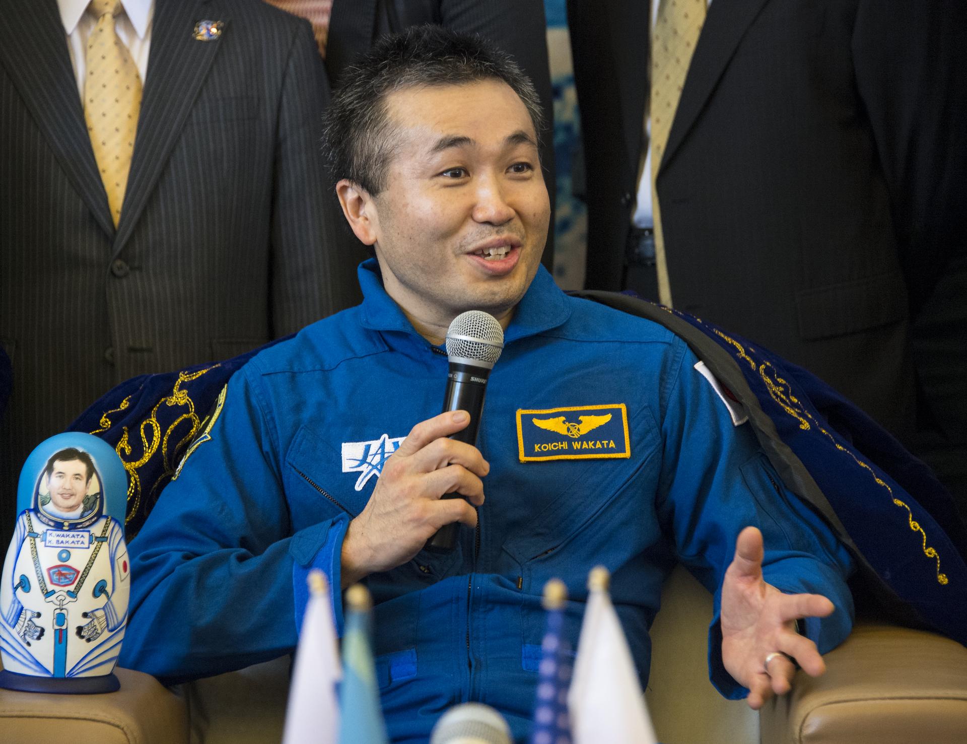 Expedition 39 Commander Koichi Wakata of the Japan Aerospace Exploration Agency (JAXA) answers questions from the media during a welcome home ceremony, Wednesday, May 14, 2014 at the Karaganda Airport in Kazakhstan. Wakata, Expedition 39 Soyuz Commander Mikhail Tyurin of Roscosmos, and Flight Engineer Rick Mastracchio of NASA landed in their Soyuz TMA-11M spacecraft just a few hours earlier near the town of Zhezkazgan. Wakata, Tyurin and Mastracchio returned to Earth after more than six months onboard the International Space Station where they served as members of the Expedition 38 and 39 crews. Photo Credit: (NASA/Bill Ingalls)
