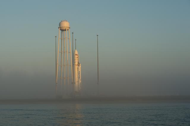 The Orbital Sciences Corporation Antares rocket, with the Cygnus spacecraft onboard, is seen during sunrise, Saturday, July 12, 2014, at launch Pad-0A of NASA's Wallops Flight Facility in Virginia. The Antares will launch with the Cygnus spacecraft filled with over 3,000 pounds of supplies for the International Space Station, including science experiments, experiment hardware, spare parts, and crew provisions. The Orbital-2 mission is Orbital Sciences' second contracted cargo delivery flight to the space station for NASA. Photo Credit: (NASA/Bill Ingalls)