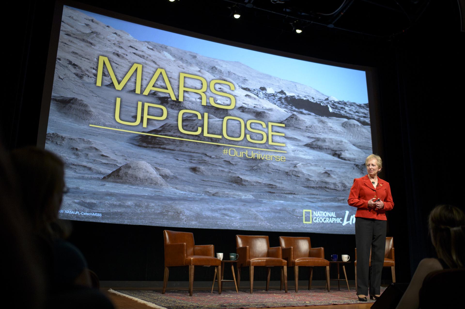 Pan Conrad, deputy principal investigator, Sample Analysis at Mars team, NASA‘s Goddard Space Flight Center, discusses what we’ve learned from Curiosity and the other Mars rovers during a “Mars Up Close” panel discussion, Tuesday, August 5, 2014, at the National Geographic Society headquarters in Washington. Photo Credit: (NASA/Bill Ingalls)