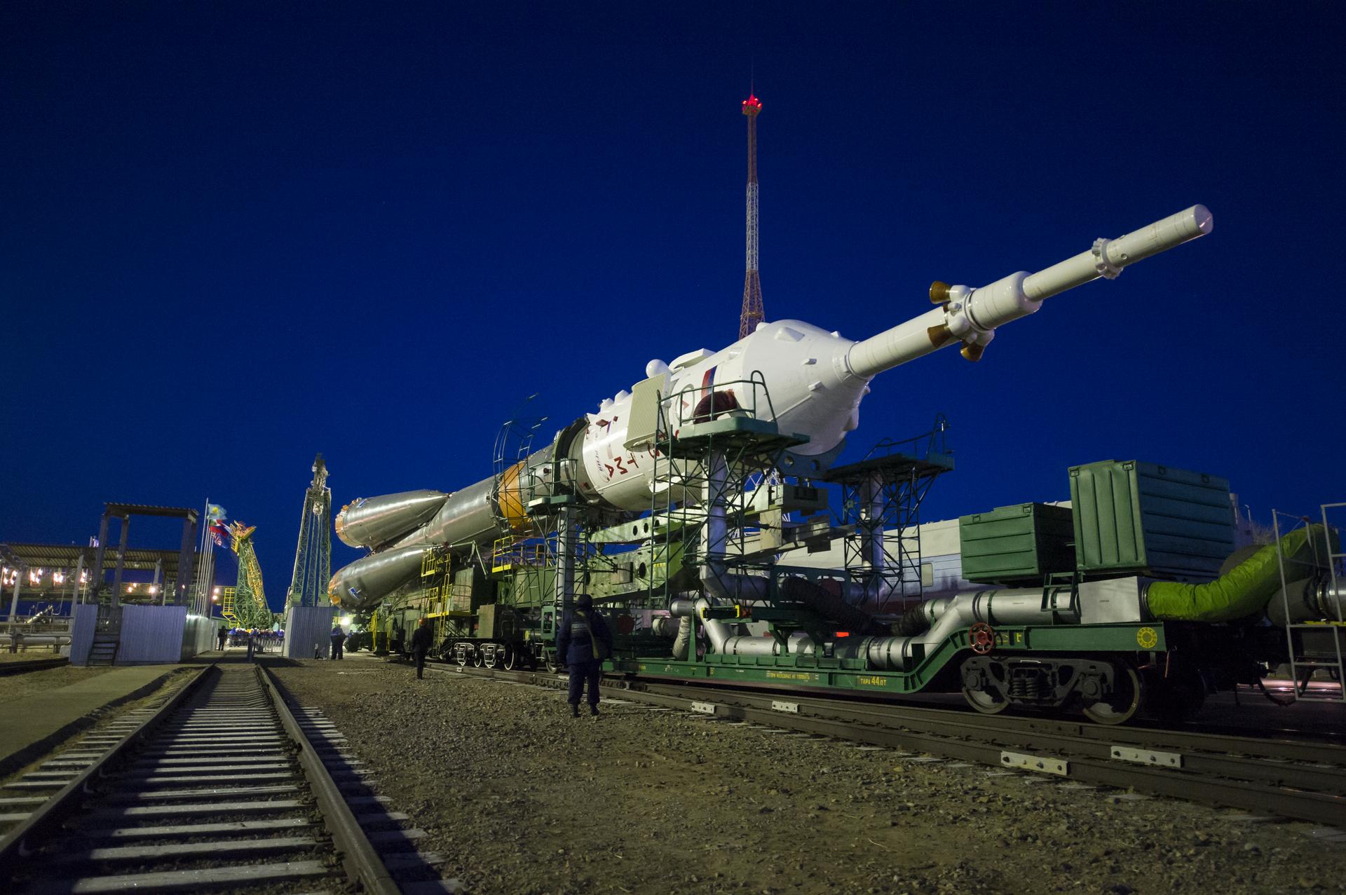 The Soyuz TMA-15M spacecraft is rolled out to the launch pad by train on Friday, Nov. 21, 2014 at the Baikonur Cosmodrome in Kazakhstan. Launch of the Soyuz rocket is scheduled for Nov. 24 and will carry Expedition 42 Soyuz Commander Anton Shkaplerov of the Russian Federal Space Agency (Roscosmos), Flight Engineer Terry Virts of NASA , and Flight Engineer Samantha Cristoforetti of the European Space Agency into orbit to begin their five and a half month mission on the International Space Station. Photo Credit: (NASA/Aubrey Gemignani)