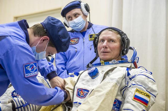 Expedition 43 Russian Cosmonaut Gennady Padalka of the Russian Federal Space Agency (Roscosmos) dons his Russian sokol suit ahead of his launch onboard the Soyuz TMA-16M spacecraft to the International Space Station with fellow crew mates, NASA Astronaut Scott Kelly, and Russian Cosmonaut Mikhail Kornienko Friday, March 27, 2015 in Baikonor, Kazakhstan. As the one-year crew, Kelly and Kornienko will return to Earth on Soyuz TMA-18M in March 2016. Photo Credit: (NASA/GCTC/Andrey Shelepin)