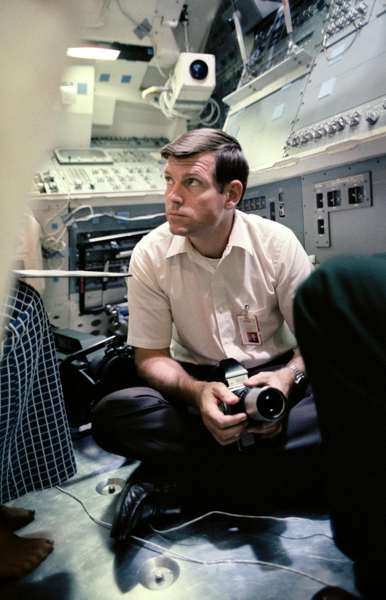 41D-3391 (10 April 1984) --- Astronaut Michael L. Coats positions himself for a photographic briefing during a training session for 41-D crew members in the shuttle one-g trainer at the Johnson Space Center (JSC). Coats will assume pilot duties aboard the space shuttle Discovery for the scheduled seven-day 41-D mission in late June. This photograph was taken for NASA by Otis Imboden.