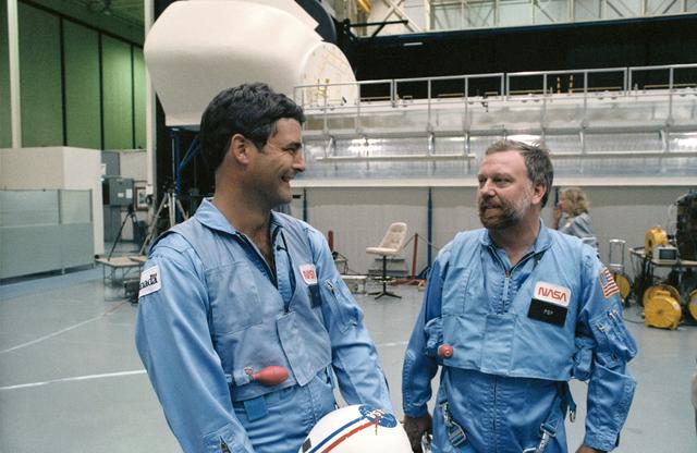 41D-3185 (S14-3185) (4 Sept 1984) --- The two payload specialists for NASA's 41-G mission aboard the Challenger chat prior to a simulation session in the Shuttle mockup and integration laboratory at the Johnson Space Center. They are Marc Garneau, left, representing the Canadian National Research Council, and Paul D. Scully-Power, an oceanographer with the U.S. Navy. They are standing near the manipulator development facility (MDF), pictured in background.