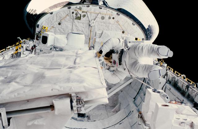 41G-13-032 (11 Oct. 1984) --- Astronaut Kathryn D. Sullivan checks the latch of the SIR-B antenna in the space shuttle Challenger's open cargo bay during her historic extravehicular activity (EVA) on Oct. 11, 1984. Earlier, America's first woman to perform an EVA and astronaut David C. Leestma, participated in an in-space simulation of refueling a spacecraft in orbit. The Orbital Refueling System (ORS) is just beyond the astronaut mission specialist's helmet. To the left is the Large Format Camera (LFC). The LFC and ORS are stationed on a device called the Mission Peculiar Support Structure (MPESS). Crew members consisted of astronauts Robert L. Crippen, commander; Jon A. McBride, pilot; along with Kathryn D. Sullivan, Sally K. Ride, and David D. Leestma, all mission specialists; and Canadian astronaut Marc Garneau and Paul D. Scully-Power, both payload specialist. EDITOR'S NOTE: The STS-41G mission had the first American female EVA (Sullivan); first seven-person crew; first orbital fuel transfer; and the first Canadian (Garneau).
