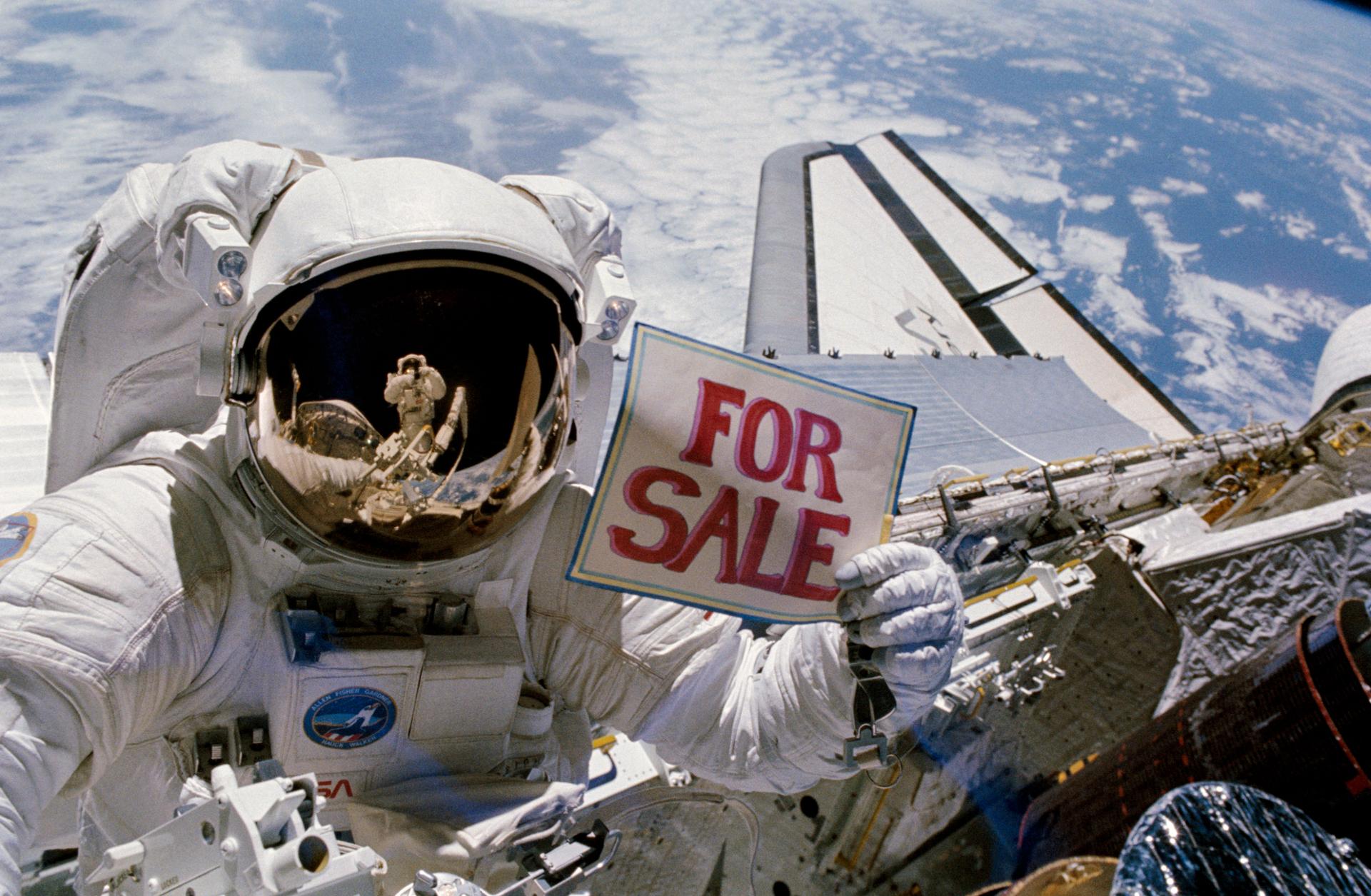 51A-104-049 (14 Nov. 1984) --- Astronaut Dale A. Gardner, having just completed the major portion of his second extravehicular activity (EVA) period in three days aboard the Earth-orbiting Discovery, holds up a for sale sign. Astronaut Joseph P. Allen IV, who also participated in the two EVA, is reflected in Gardner's helmet visor. A portion of each of two recovered satellites is in lower right corner, with Westar nearer Discovery's aft. Dr. Allen, standing on the mobile foot restraint, connected to the remote manipulator system. Photo credit: NASA