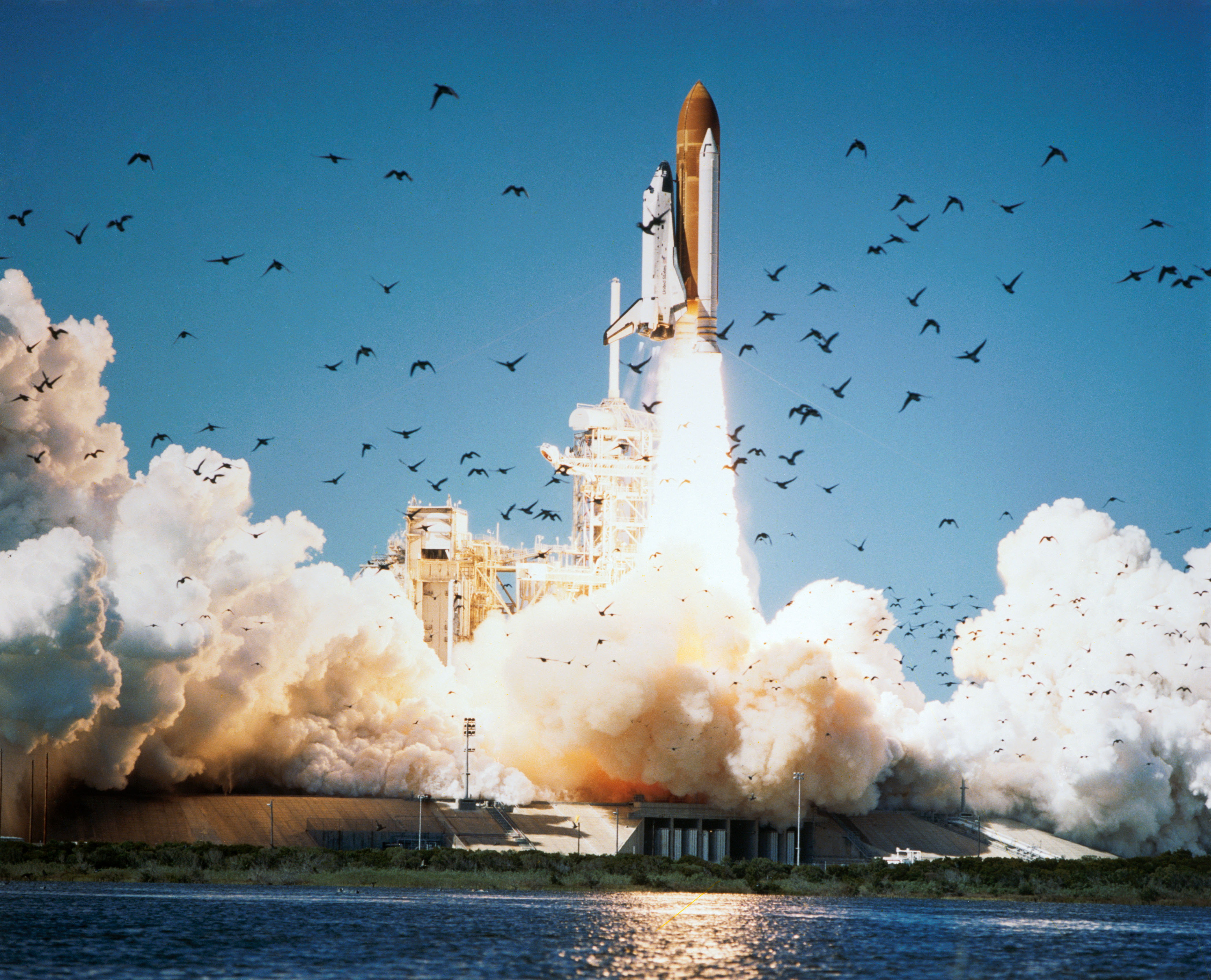 51L-S-156 (28 Jan. 1986) --- The space shuttle Challenger lifted off from Pad 39B Jan. 28, 1986 at 11:38 a.m. (EST) with a crew of seven astronauts and the Tracking and Data Relay Satellite (TDRS). An accident 73 seconds after liftoff claimed both crew and vehicle. Photo credit: NASA