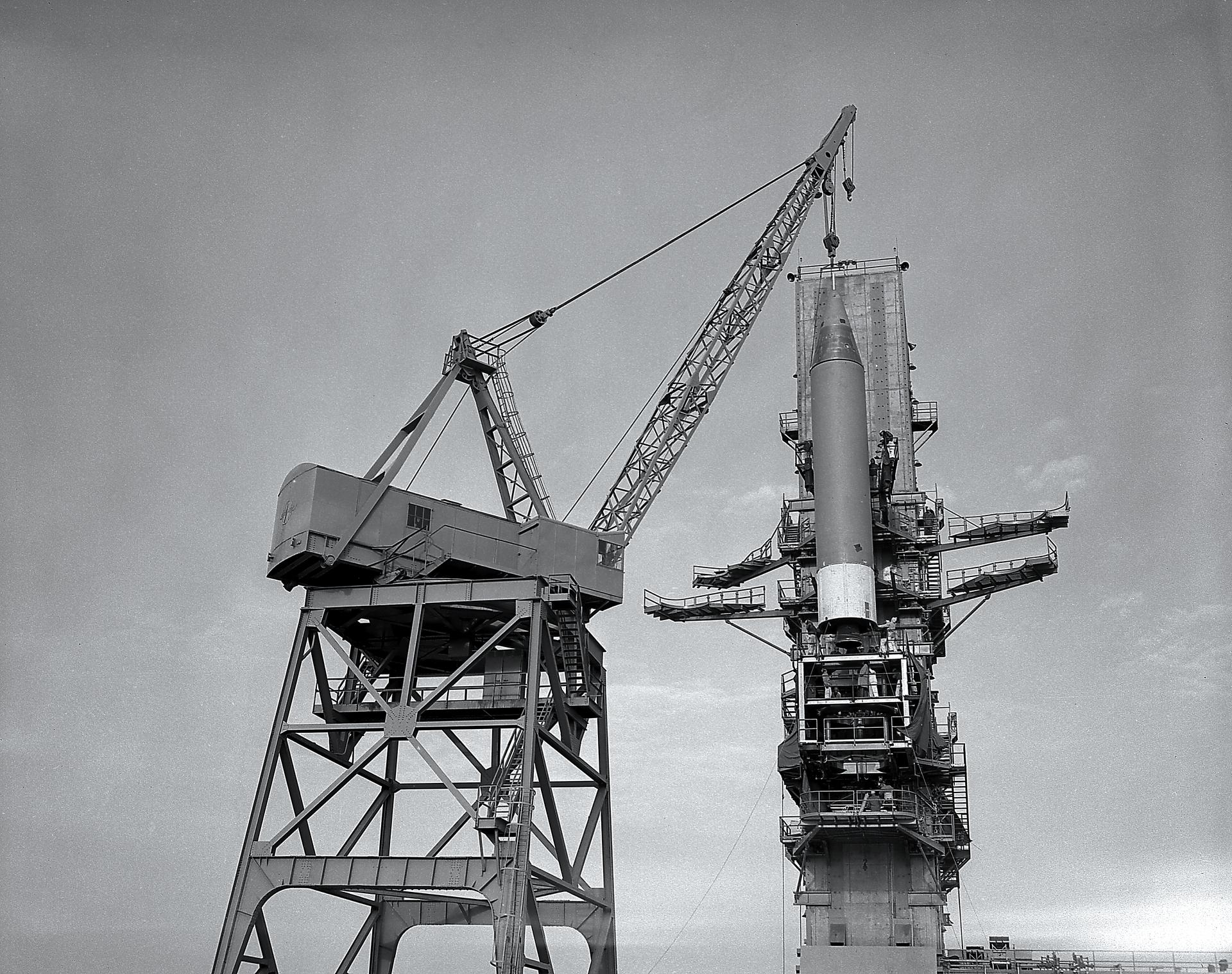 Installation of a Jupiter missile in ABMA (Army Ballistic Missile Agency) West Test Stand, Jan. 16, 1957. Jupiter was a 1500-mile range missile