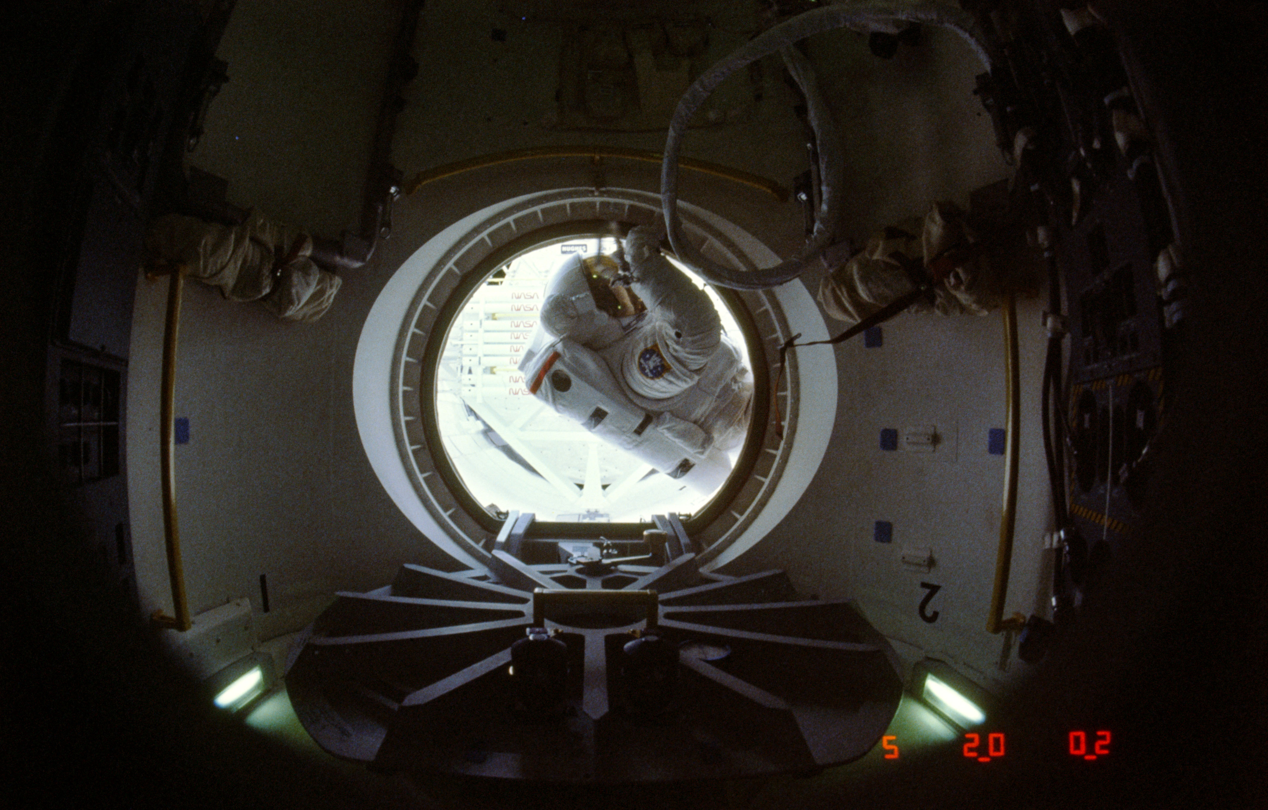 61B-08-026 (1 Dec 1985) --- Astronaut Jerry L. Ross was photographed by astronaut Bryan D. O'Connor through Atlantis's airlock as the mission specialist, fully equipped with his red-striped, white extravehicular mobility unit (EMU), moved out into the cargo bay to begin one of two lengthy extravehicular activities (EVA) on the week-long STS 61-B mission.