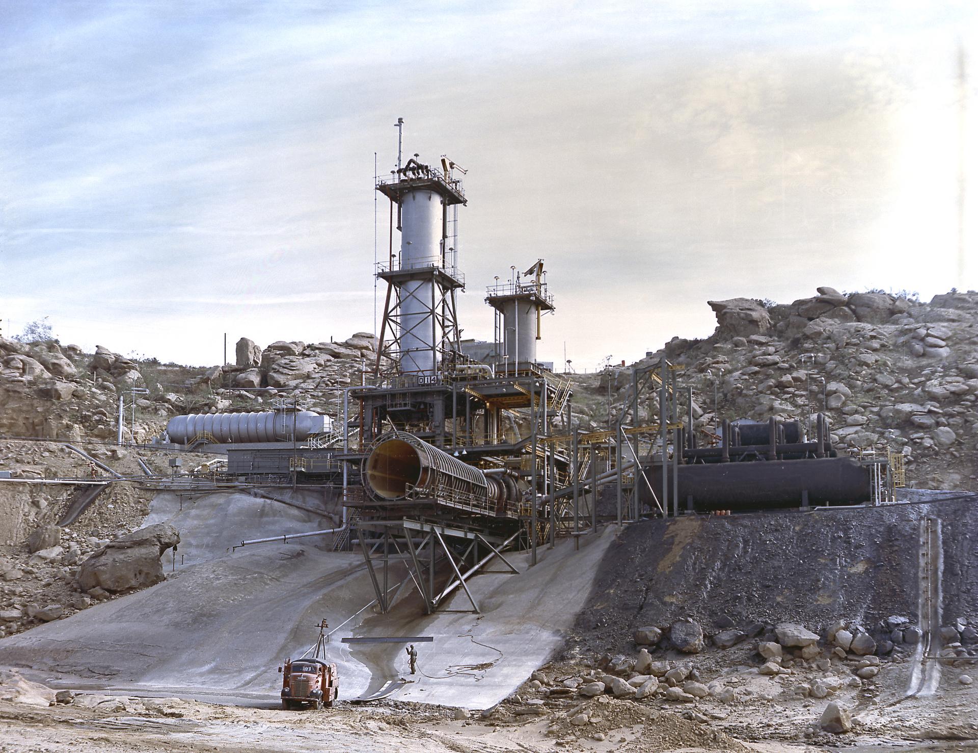 This image depicts an overall view of the vertical test stand for testing the J-2 engine at Rocketdyne's Propulsion Field Laboratory, in the Santa Susana Mountains, near Canoga Park, California. The J-2 engines were assembled and tested at Rocketdyne under the direction of the Marshall Space Flight Center.