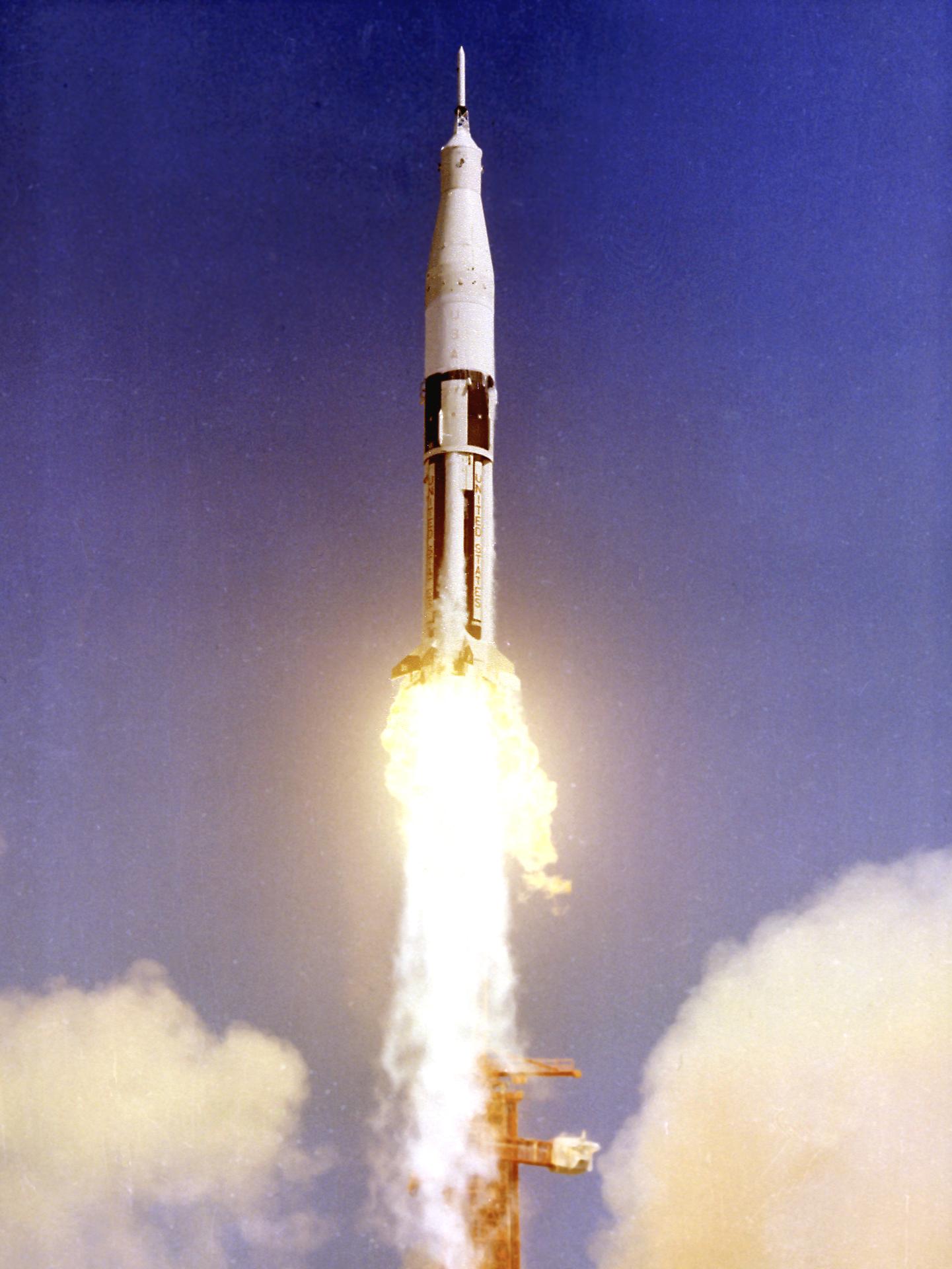 AS-201, the first Saturn IB launch vehicle developed by the Marshall Space Flight Center (MSFC), lifts off from Cape Canaveral, Florida, February 26, 1966. This was the first flight of the S-IB and S-IVB stages, including the first flight test of the liquid-hydrogen/liquid oxygen-propelled J-2 engine in the S-IVB stage. During the thirty-seven minute flight, the vehicle reached an altitude of 303 miles and traveled 5,264 miles downrange. In all, nine Saturn IB flights were made, ending with the Apollo Soyuz Test Project (ASTP) in July 1975.