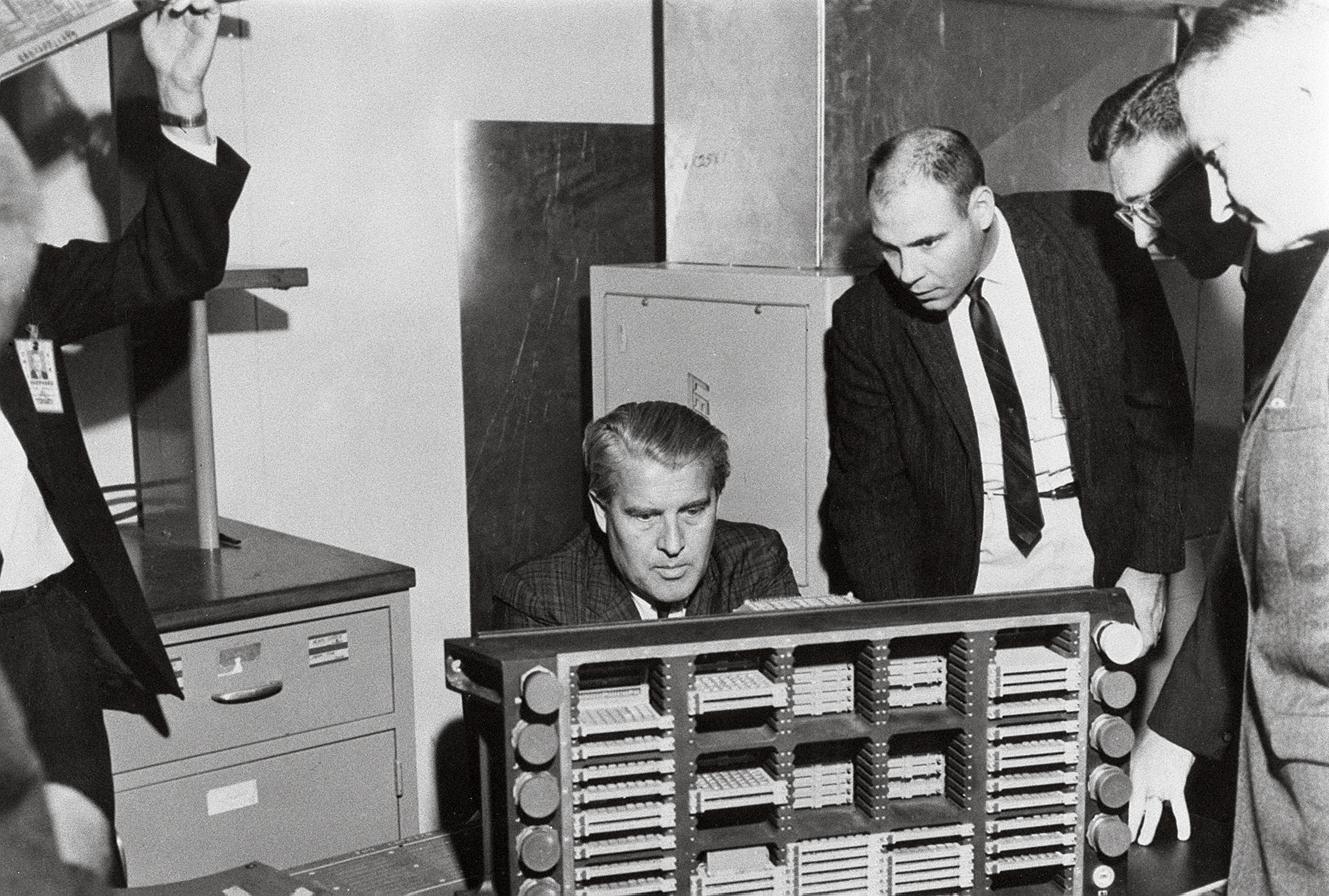 This photograph is dated March 10, 1966, and shows Dr. von Braun (seated) examining a Saturn computer in the Astrionics Laboratory at the Marshall Space Flight Center. Standing left to right are J.B. White, Brooks Moore, and Herman K. Weidner.