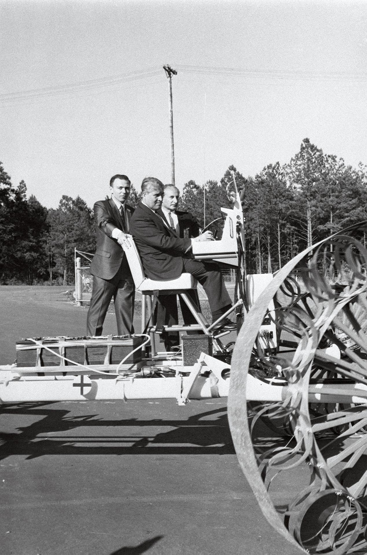In this June 1966 photograph, Marshall Space Flight Center Director Dr. Wernher von Braun test-drives the Mobility Test Article (MTA), a developmental vehicle built by the Bendix Corporation to test lunar mobility vehicle concepts. The data provided by the MTA helped in designing the Lunar Roving Vehicle (LRV), developed under the direction of the MSFC. The LRV was designed to allow Apollo astronauts a greater range of mobility during lunar exploration missions. The LRVs were deployed during the last three Apollo missions; Apollo 15, Apollo 16, and Apollo 17.