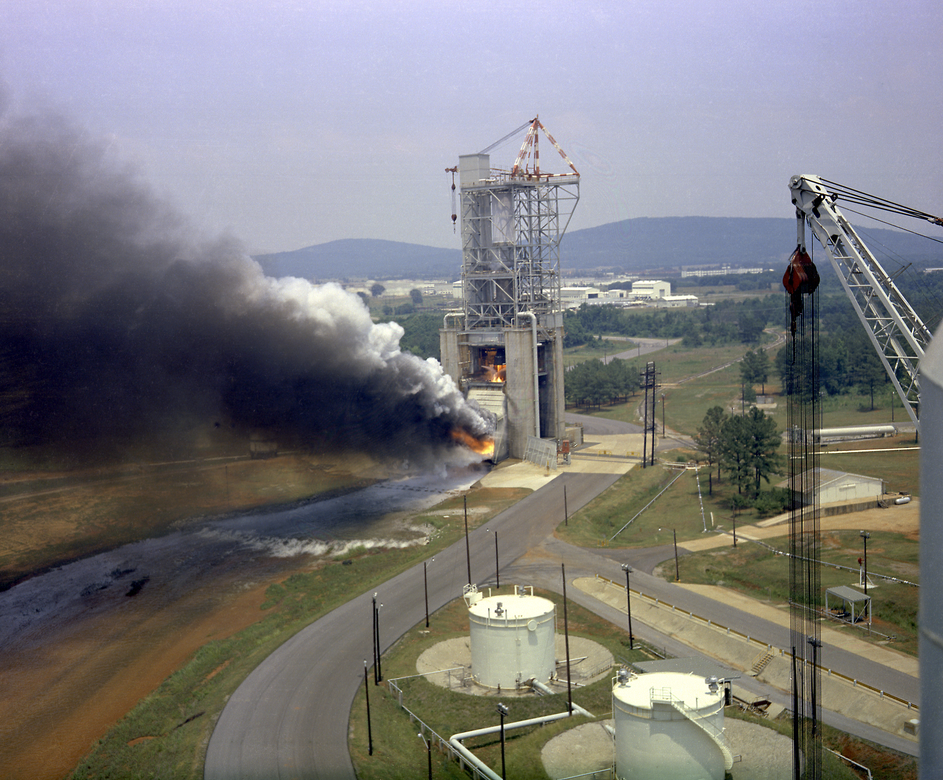 This photograph depicts a test firing of an F-1 engine at the F-1 engine test stand in the west test area of the Marshall Space Flight Center. This engine produced 1,500,000 pounds of thrust using liquid oxygen and RP-1, which is a derivative of kerosene. The F-1 engine test stand was constructed in 1963 to assist in the development of the F-1 engine.