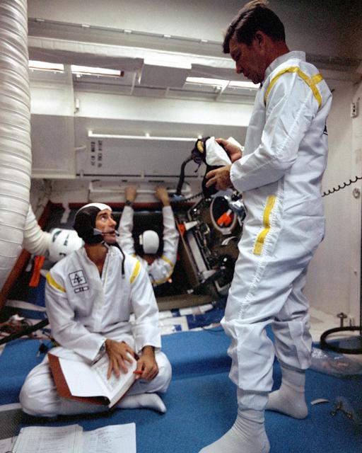 KENNEDY SPACE CENTER, FLA. - Apollo 7 Command Module Pilot Donn F. Eisele enters the spacecraft at Pad 34 while fellow crew members, Commander Walter M. Schirra Jr., left, and Lunar Module Pilot Walter Cunningham hold a brief discussion before they repeat that portion of the Plugs-Out test at the pad. The tests are being conducted in preparation for the scheduled launch of Apollo 7, the first manned lunar orbital mission.
