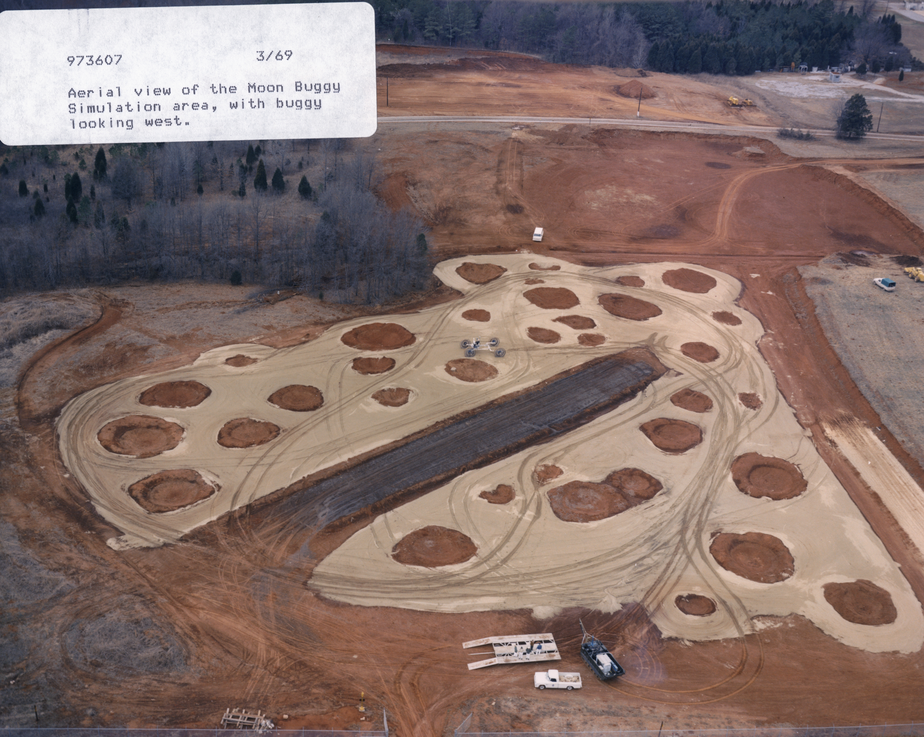 This in an aerial view (looking west) of a Lunar Roving Vehicle (LRV), often referred to as “Moonbuggy”, simulator area built at the Marshall Space Flight Center (MSFC) where tesing was performed. The LRV was developed under the direction of MSFC to provide astronauts with greater mobility on the lunar surface.