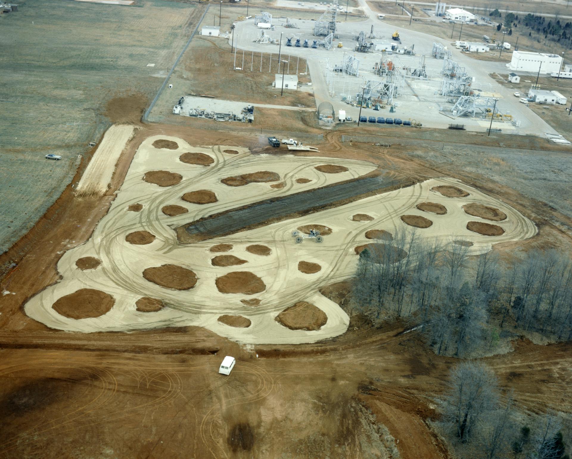 This in an aerial view (looking east) of a Lunar Roving Vehicle (LRV), often referred to as “Moonbuggy”, simulator area built at the Marshall Space Flight Center (MSFC) where testing was performed. The LRV was developed under the direction of MSFC to provide astronauts with greater mobility on the lunar surface. Visible in the background is the 18-acre facility known as the Random Motion/ Lift-Off Simulator or ‘Arm Farm’ which was developed to test the Saturn swingarm mechanisms that were used to hold the rocket in position until lift-off.