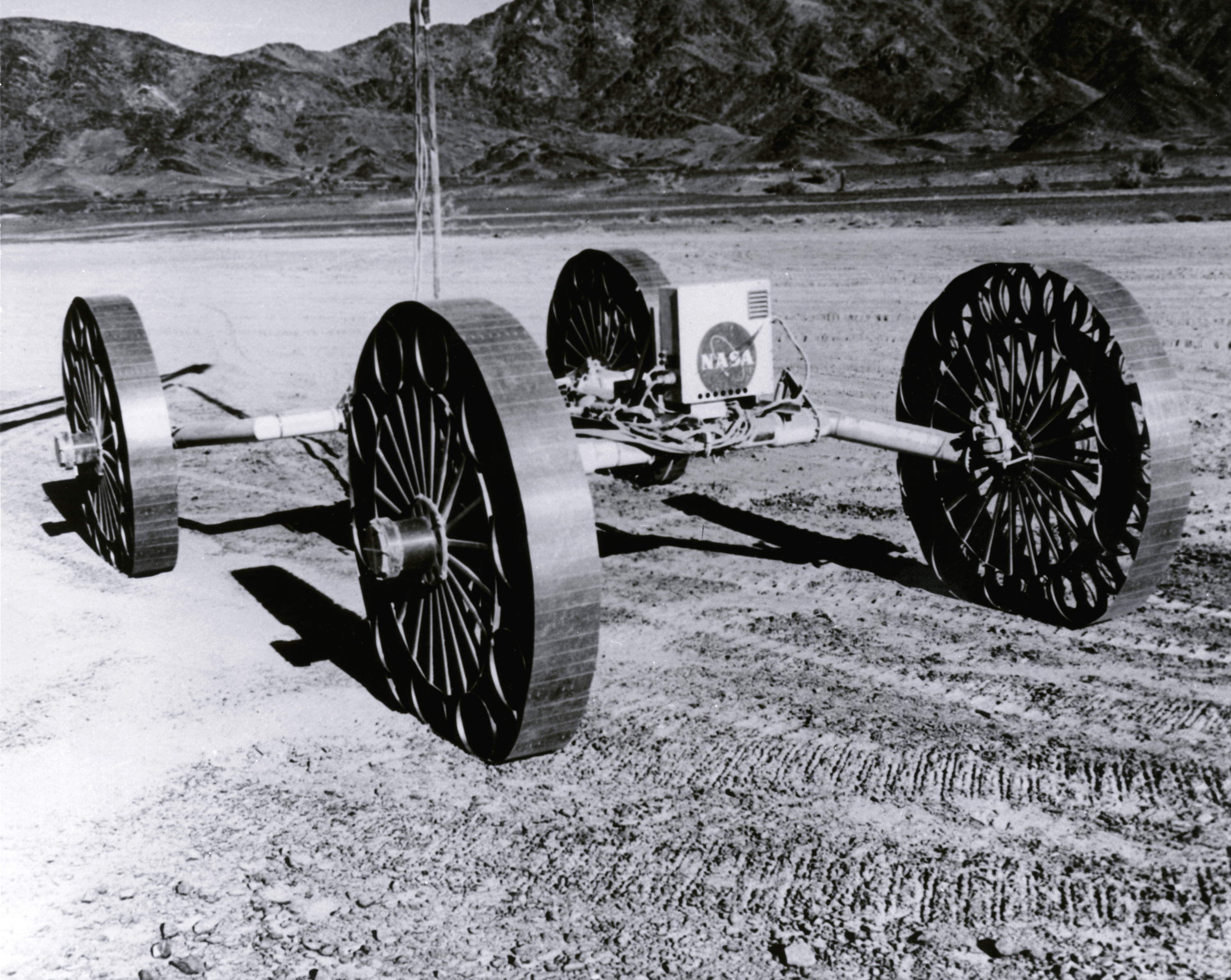 This Mobility Test Article (MTA), built by the Bendix Corporation for NASA’s Marshall Space Flight Center (MSFC), was driven over rocks in Arizona. The data provided by the MTA helped in designing the Lunar Roving Vehicle (LRV), developed under the direction of the MSFC. The LRV was designed to allow Apollo astronauts a greater range of mobility during lunar exploration missions.